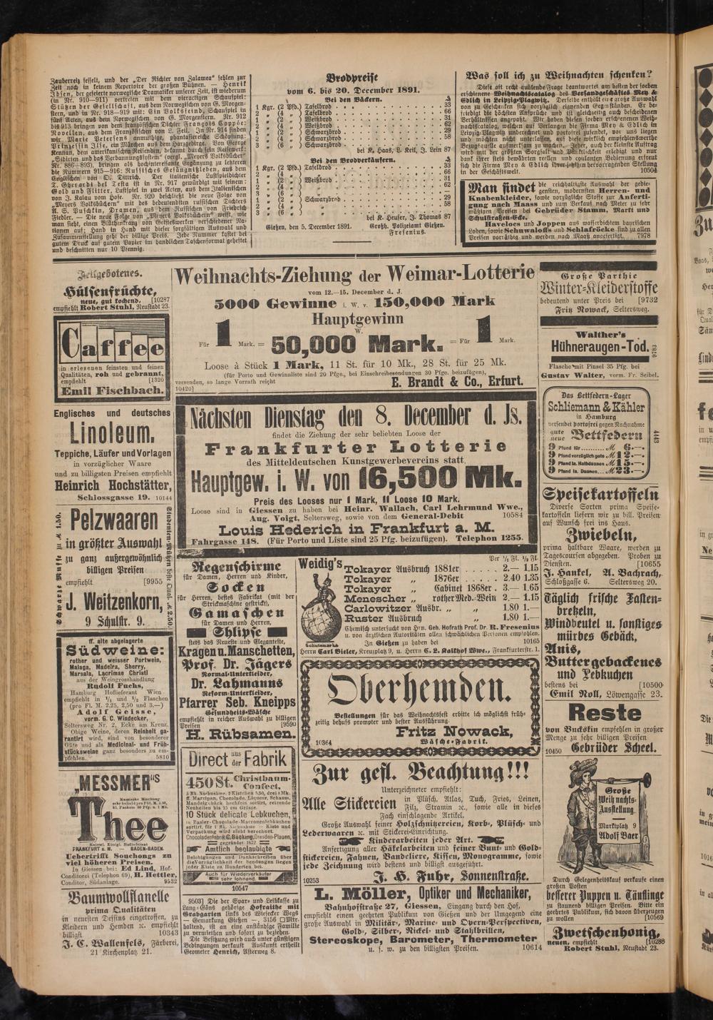 Gießen, den 5. December 1891. Großh. Polizeiamt Gießen. Fresenius.