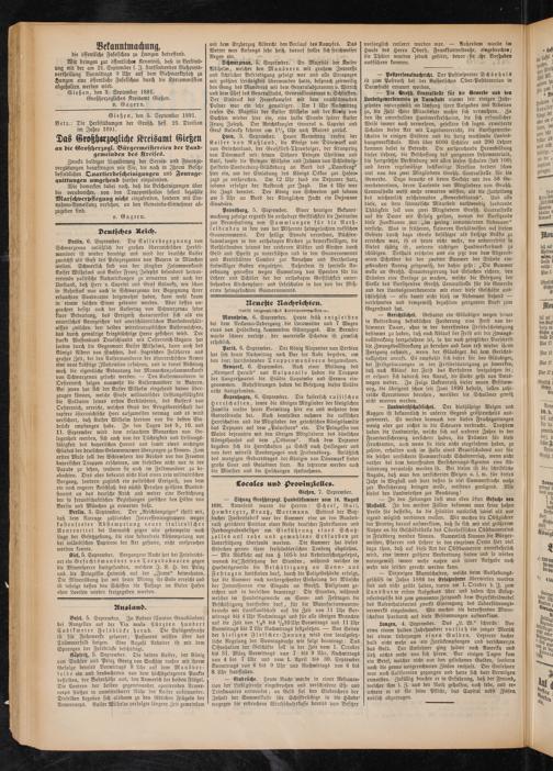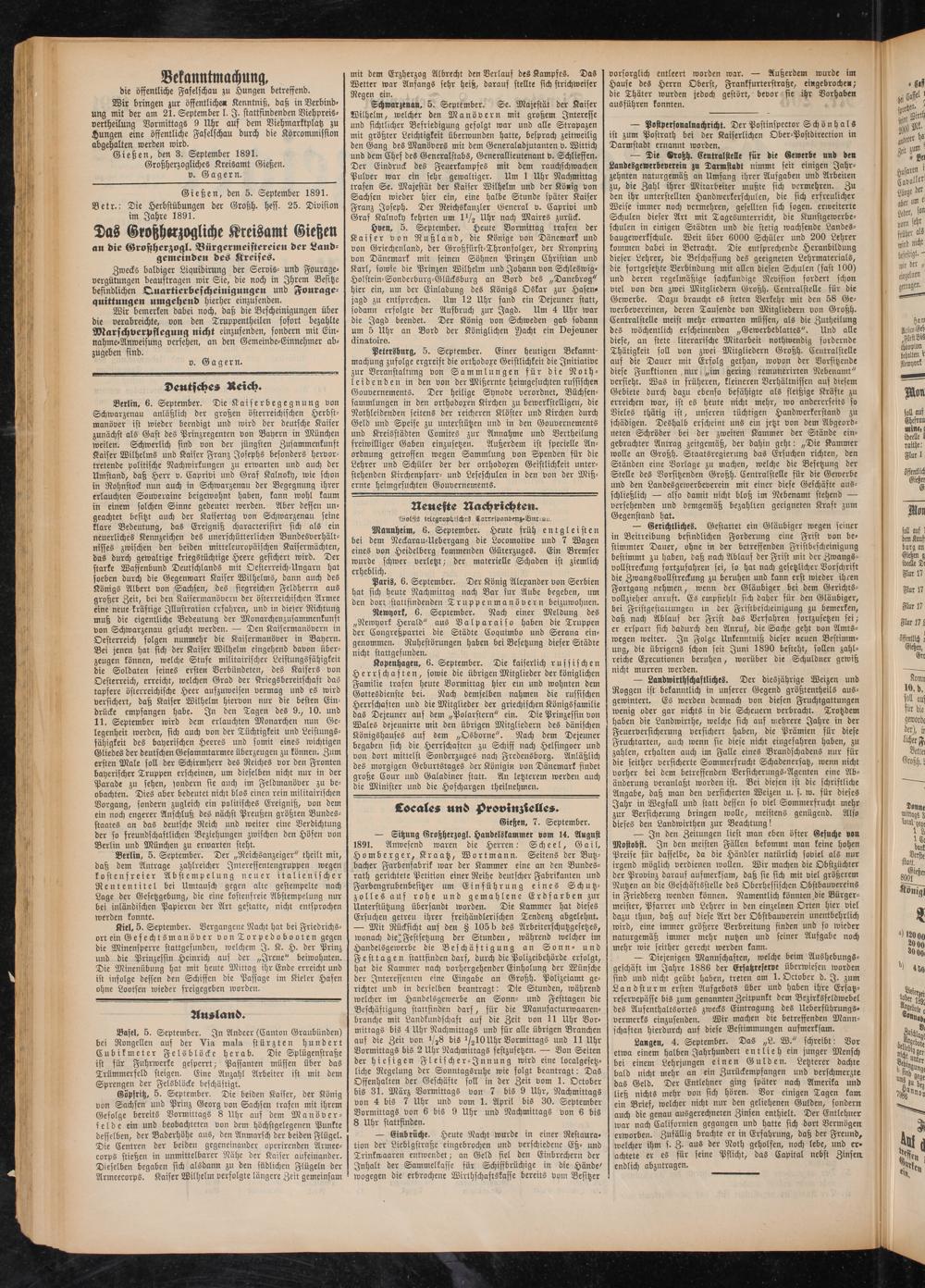 Gießen, den 3. September 1891. Großherzogliches Kreisamt Gießen, v. Gagern.