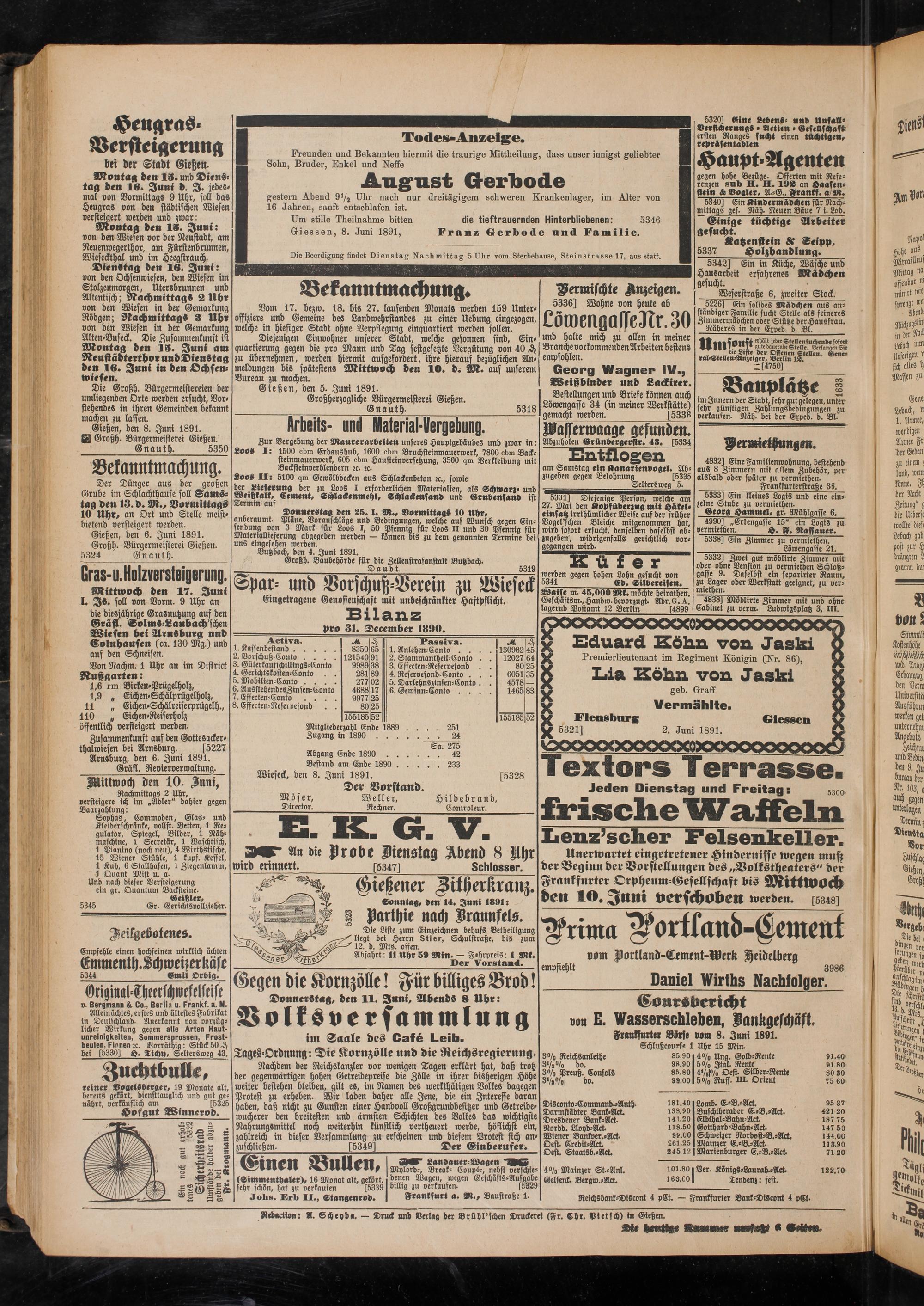 Gießen, den 8. Juni 1891. E Großh. Bürgermeisterei Gießen.