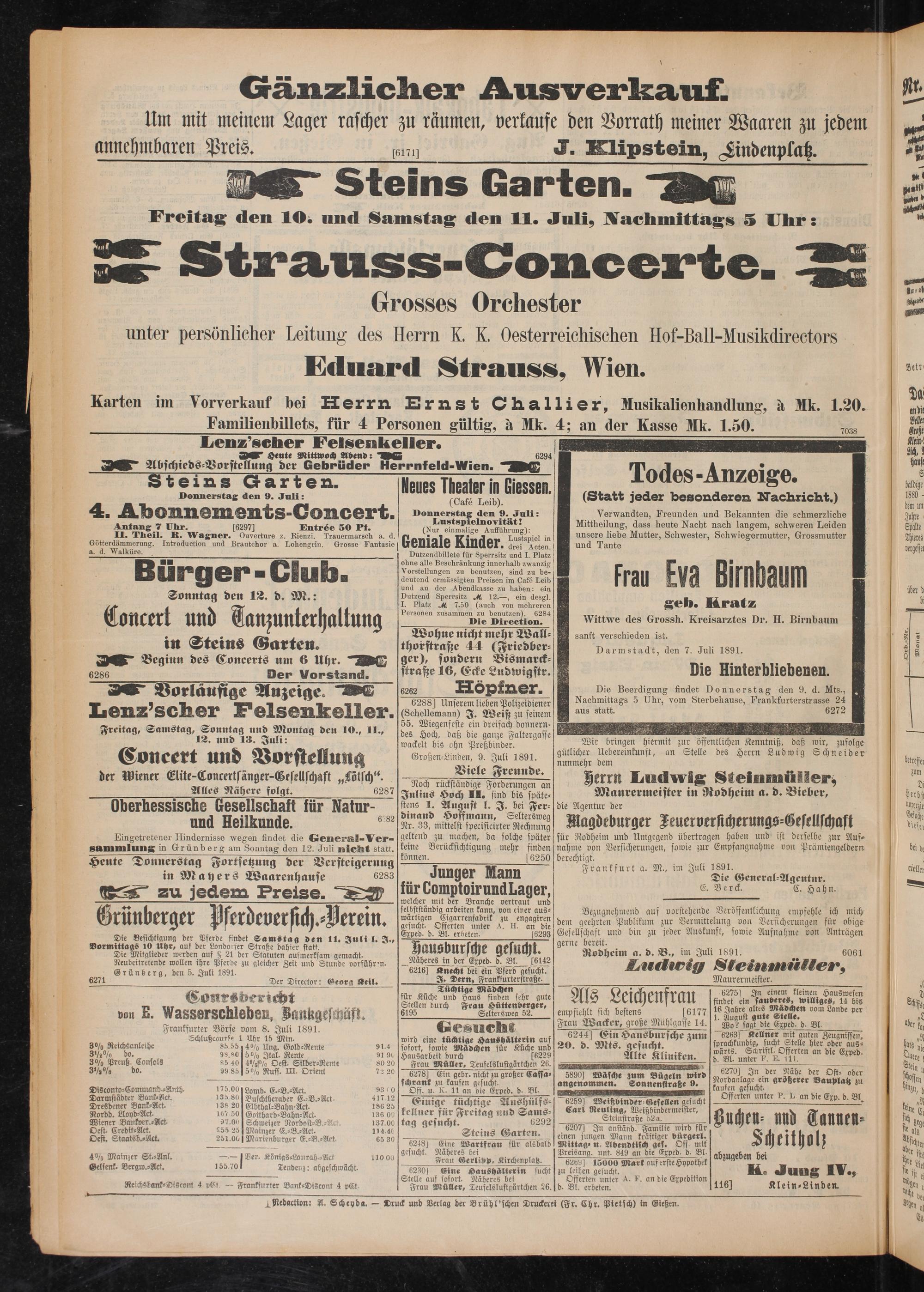 Die Beerdigung findet Donnerstag den 9. d. Mts., Nachmittags 5 Uhr, vom Sterbehause, Frankfurterstrasse 24 aus statt. 6272