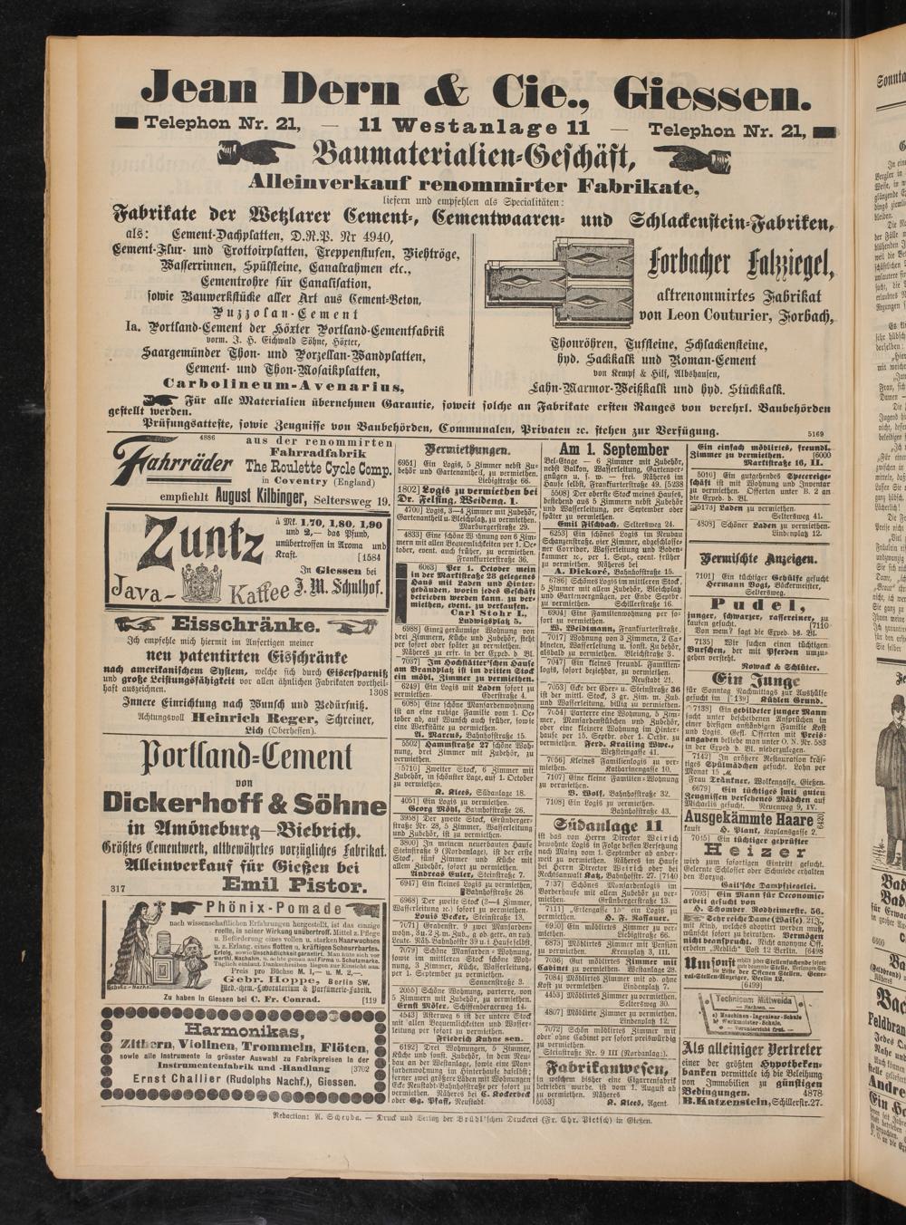 Poriland-Cement von Dickerhoff & Söhne in Amöneburg—Biebrich. Größtes CementwerK, Memhrtes vorzügliches Fabrikat. Alleinverkauf für Gießen bei