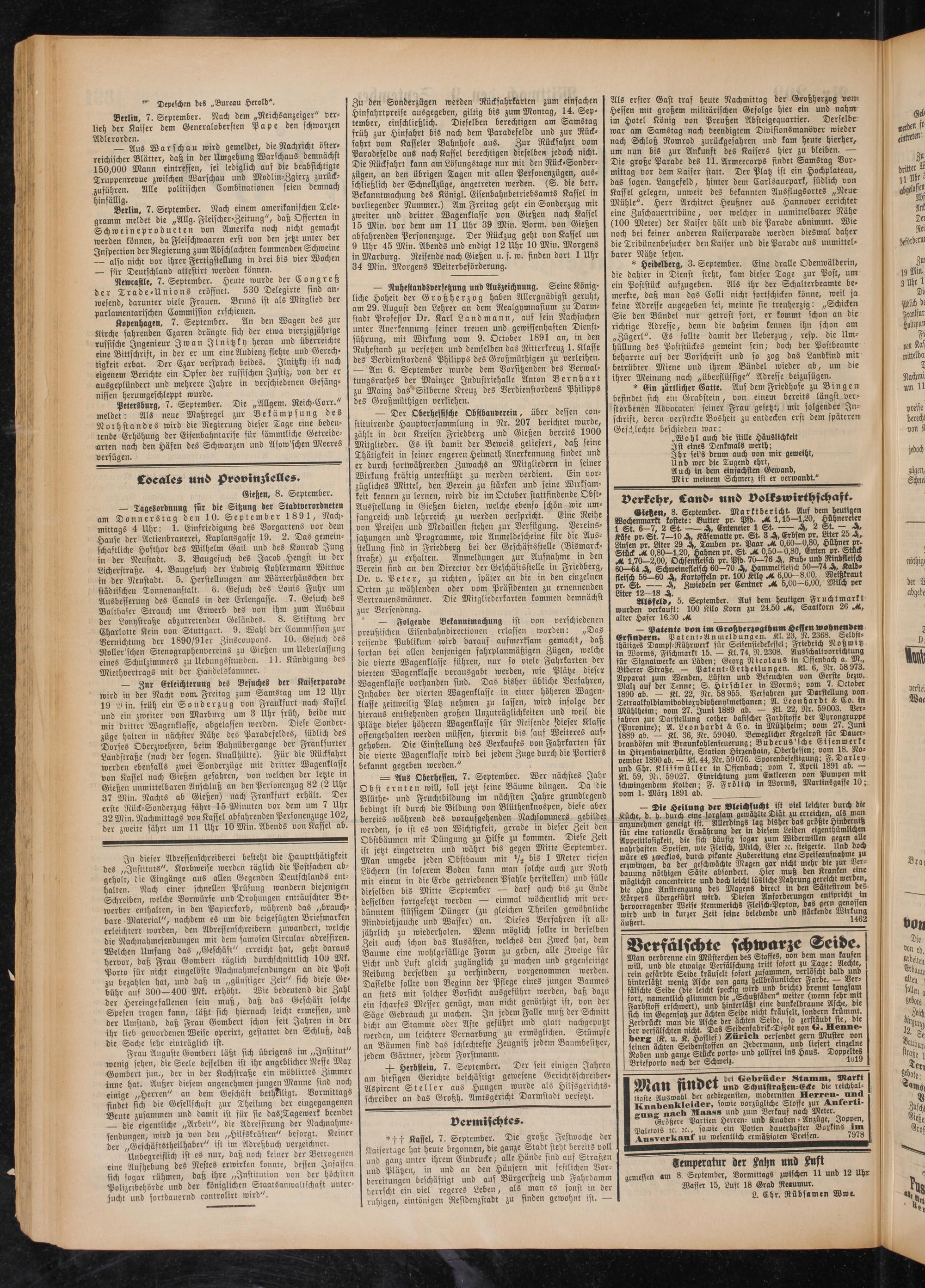 — Tagesordnung für die Sitzung der Stadtverordneten am Donnerstag den 10. September 1891, Nachmittags 4 Uhr: 1. Einfriedigung des Vorgartens vor dem Hause der Actienbrauerei, Kaplansgasse 19. 2. Das gemeinschaftliche Hofthor des Wilhelm Gail und des Konrad Jung in der Neustadt. 3. Baugesuch des Jacob Hengst in der Licherstraße. 4. Baugesuch der Ludwig Kohlermann Wittwe in der Neustadt. 5. Herstellungen am Wärterhäuschen der städtischen Tonnenanstalt. 6. Gesuch des Louis Fuhr um Ausbesserung des Canals in der Erlengasse. 7. Gesuch des Balthaser Strauch um Erwerb des von ihm zum Ausbau der Lonystraße abzutretenden Geländes. 8. Stiftung der Charlotte Kein von Stuttgart. 9. Wahl der Commission zur Vernichtung der 1890/91er Zinscoupons. 10. Gesuch des Roller'schen Stenographenvereins zu Gießen um Überlassung eines Schulzimmers zu Uebungsstunden. 11. Kündigung des Mietvertrags mit der Handelskammer.