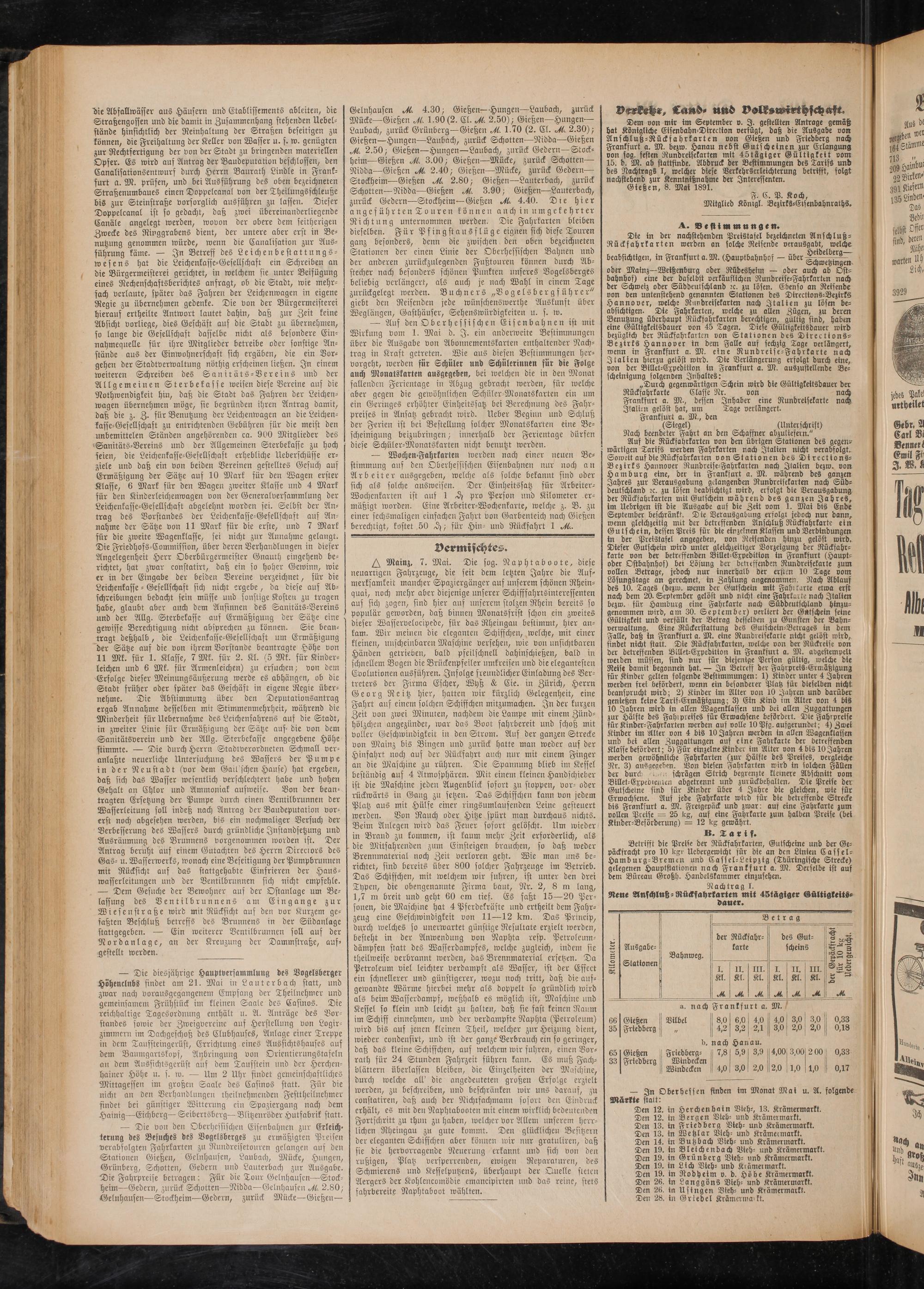 Dem von mir im September v. I. gestellten Anträge gemäß hat Königliche Eisenbahn-Dtrection verfügt, daß die Ausgabe von Anschluß-Rückfahrkarten von Gießen und Friedberg nach Frankfurt a. M. bezw. Hanau nebst Gutscheinen zur Erlangung von sog. festen Rundretsekarten mit 45tägiger Gültigkeit vom 15, d. M. ab stattfinde. Abdruck der Bestimmungen des Tarifs und des Nachtrags I, welcher diese Verkehrserleichterung betrifft, folgt nachstehend zur Kenntnißnahmc der Interessenten.