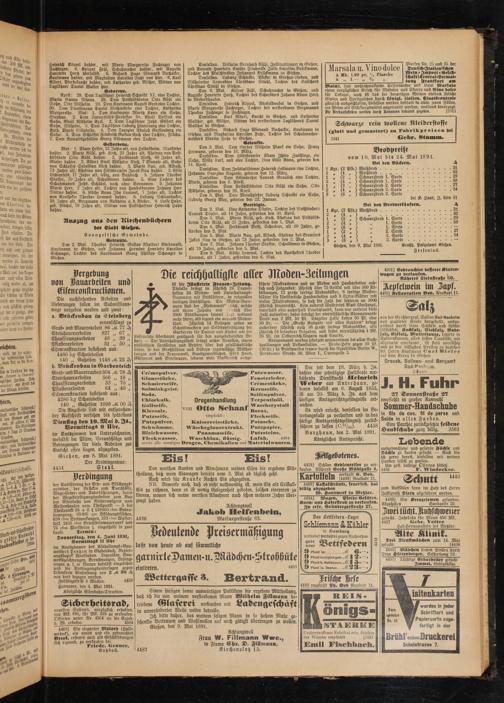 Mai: 1. Adam Heiser, 21 Jahre alt, von Heidesheim, Musketier dahier. 2. Marte Rühl, geb. Koch, 23 Jahre alt, Ehefrau von Posthilfsbote Otto Rühl dahier. 2. Ferdinand Weiß, 60 Jahre alt, Glaser dahier. 2. Albert Emil Wilhelm Nieß, 7 Monate alt, Sohn von Schlosser Sebastian Meß dahier. 3. Marie Rau, geb. Albach, 72 Jahre alt, Ehefrau von Hilfsbremser Jacob Rau dahier. 3. Elise Lichtenfels, 17 Jahre alt, ledig, von Butzbach. 5. Johann Theodor Stoffer, 70 Jahre alt, Schuldiener dahier. 5. Eine Tochter des Schutzmanns Johs. Schädel, noch ohne Vornamen. 5. Johanna Marte Herr, 2 Jahre alt, Tochter von Handelsmann Johann Herr Wtttwe dahier. 6. Käthe Anna Ida Lommel, 7 Jahre alt, Tochter von Apotheker Theodor Lommel dahier. 6. Ludwig Schleenbecker, 18 Jahre alt, Bergmann von Rodhetm a. d. Bieber. 8. Luise Hahn, geb. Michel, 78 Jahre alt, Wittwe von Postschaffner Heinrich Hahn dahier.