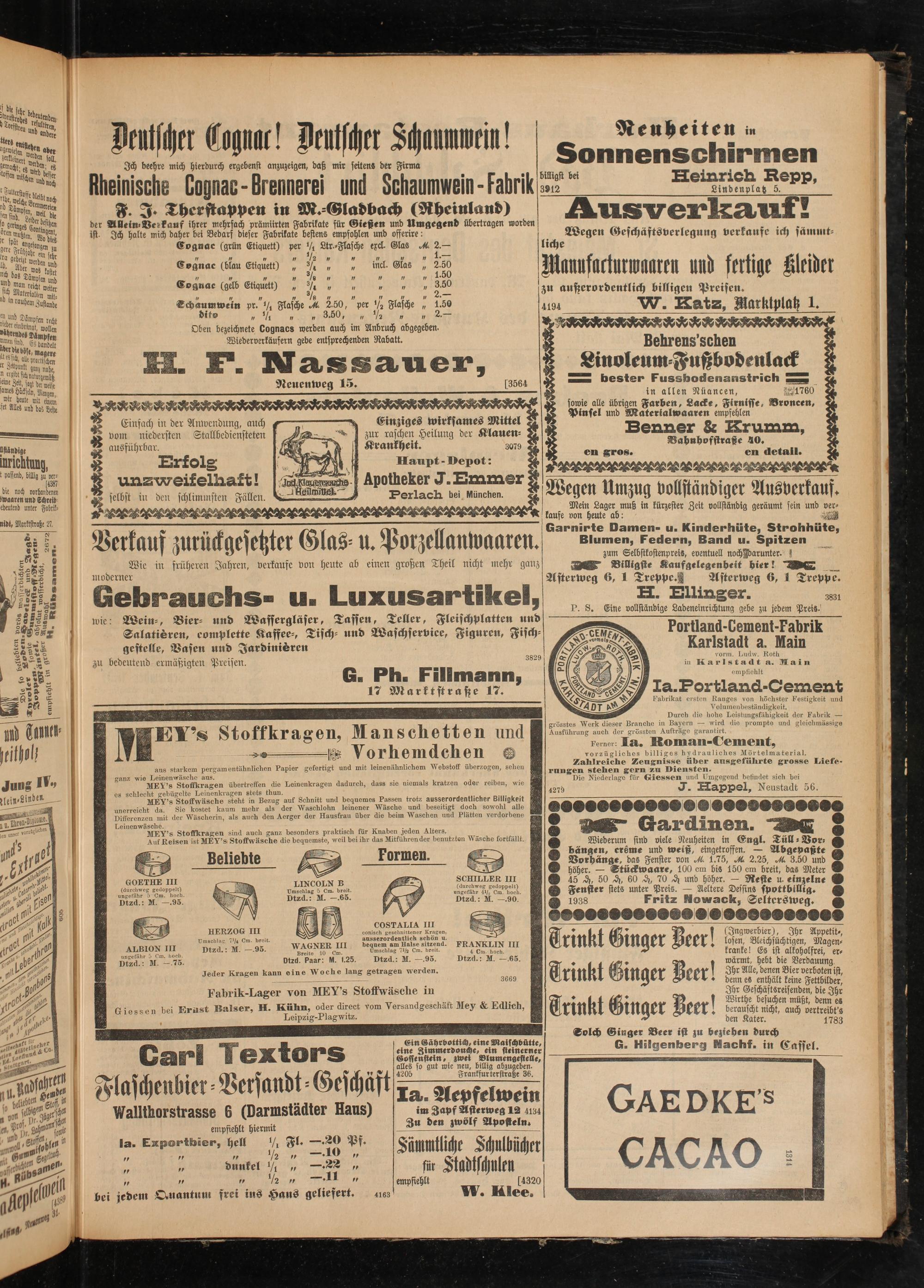 der Allein» Be-kauf ihrer mehrfach prämiirten Fabrikate für Gießen und Umgegend übertragen ist- Ich halte mich daher bei Bedarf dieser Fabrikate bestens empfohlen und offerire: