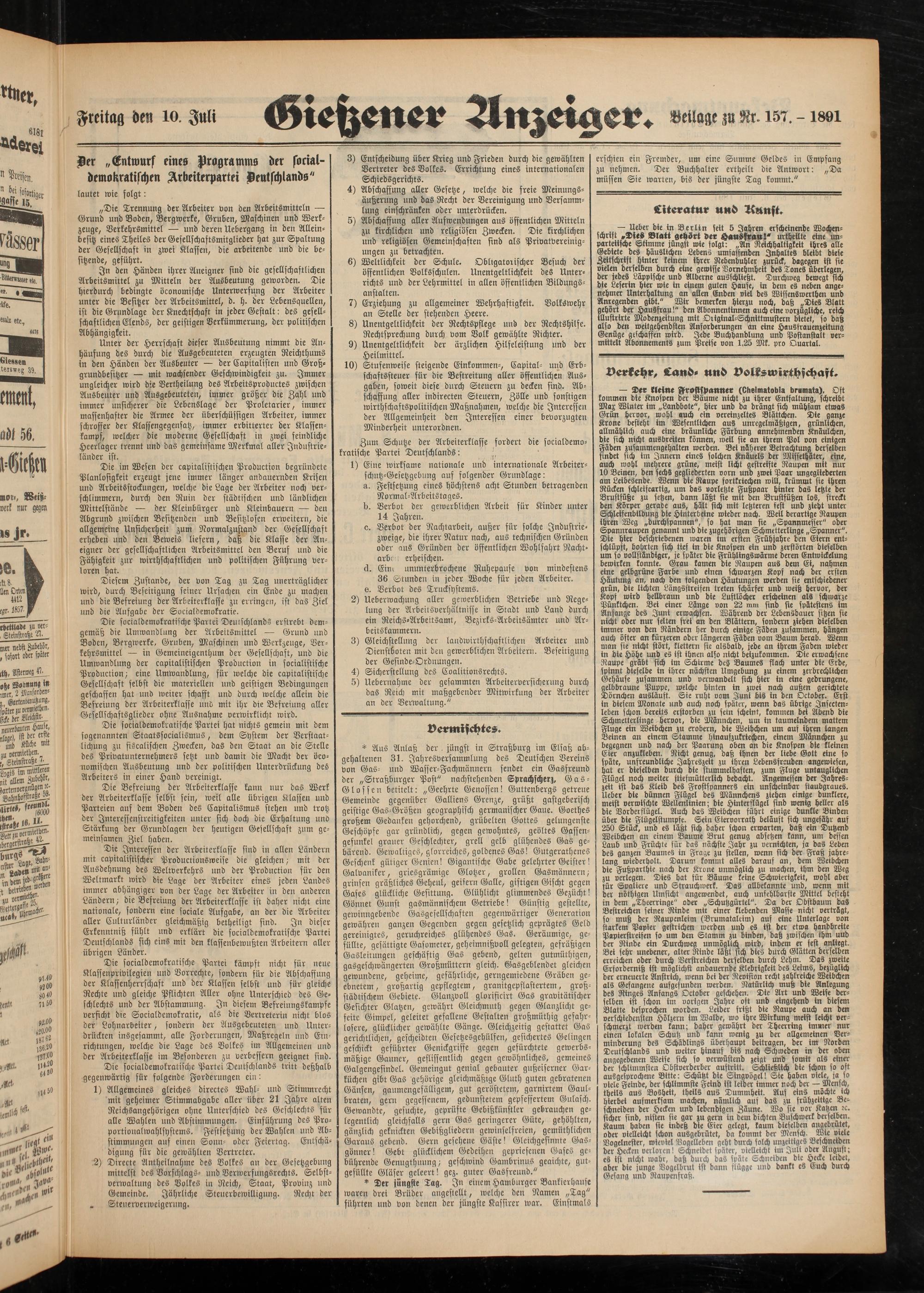 Die socialdemokratische Partei kämpft nicht für neue Klaffenprivilegien und Vorrechte, sondern für die Abschaffung der Klassenherrschaft und der Klassen selbst und für gleiche Rechte und gleiche Pflichten Aller ohne Unterschied des Geschlechts und der Abstammung. In diesem Befreiungskämpfe versicht die Socialdemokratie, als die Vertreterin nicht blos der Lohnarbeiter, sondern der Ausgebeuteten und Unterdrückten insgesammt, alle Forderungen, Maßregeln und Em- richtungen, welche die Lage des Volkes im Allgemeinen und der Arbeiterklasse im Besonderen zu verbessern geeignet sind.