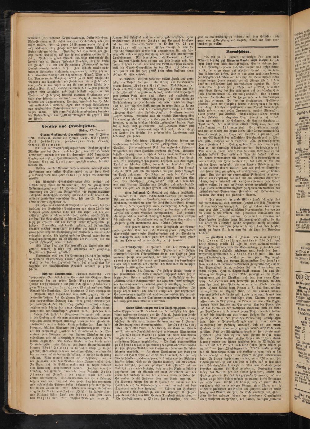 — Kleine Mittheilungen aus dem Großherzogthum. Einem alten Ehepaare in Bickenbach wurde anläßlich der Feier seiner goldenenen Hochzeit von Sr. Königl. Hoheit dem Großherzog ein Geschenk von 50 Mark zugewendet. — InMainz beschloß die Stadtverordneten-Versammlung am 7. Januar die Errichtung eines Gewerbegerichts. — Im Kreise Mainz treten sofort 300 Leute in den Genuß der ihnen auf Grund des Alters- und Jnvaliditätsgesetzes zustehenden Altersrenten — Die Mainzer Gärtner haben sich einer von Berlin ausgehenden Petition um Einführung eines Zolles auf ab- geschnittene Blumen angefchlossen. — Die Kreisschulcommission zu O f s e n b a ch hat zur Jnspicirung des Handarbeitsunterrichts für schulpflichtige Mädchen des Kreises eine besondere Aufsichtslehrerin angestellt. — In einem Nachbarorte von Langen wollte ein Hausbesitzer die Leiche eines Mannes, der ihm noch Mielhe schuldete, beschlagnahmen, d. h. nicht aus der Wohnung schaffen lassen. Erst als die Glocken läuteten, und der Tobten» wagen vorfuhr, gab der Hausherr das „Pfand" frei. — Aus Bingen wird berichtet, daß dort der Rhein vollständig zugeftoren und die Eisdecke bis nahe Geisenheim auf der einen, bis Rüdesheim auf der anderen Seite passirbar fei. Es werden bereits Fußwege über den Rhein angelegt. — In Worms stürzte sich am 9. Januar ein Mann von der Hochbrücke auf die Eisenbahnschienen und verstarb auf dem Transport nach dem Hospital. — Arbeiter am Flußhafen zu Worms sind beschäftigt, ein vor ungefähr 100 Jahren gesunkenes Schiff von 1000 Centner Tragkraft auszugraben.— Die Handelskammer zu Mainz hat beschlossen, eine Ein