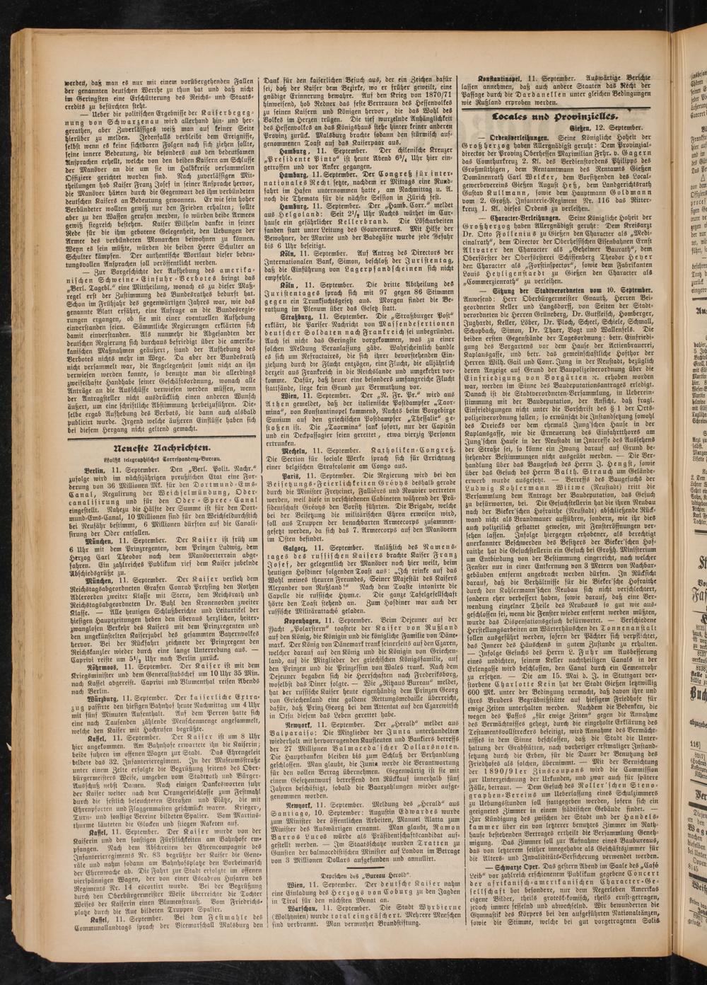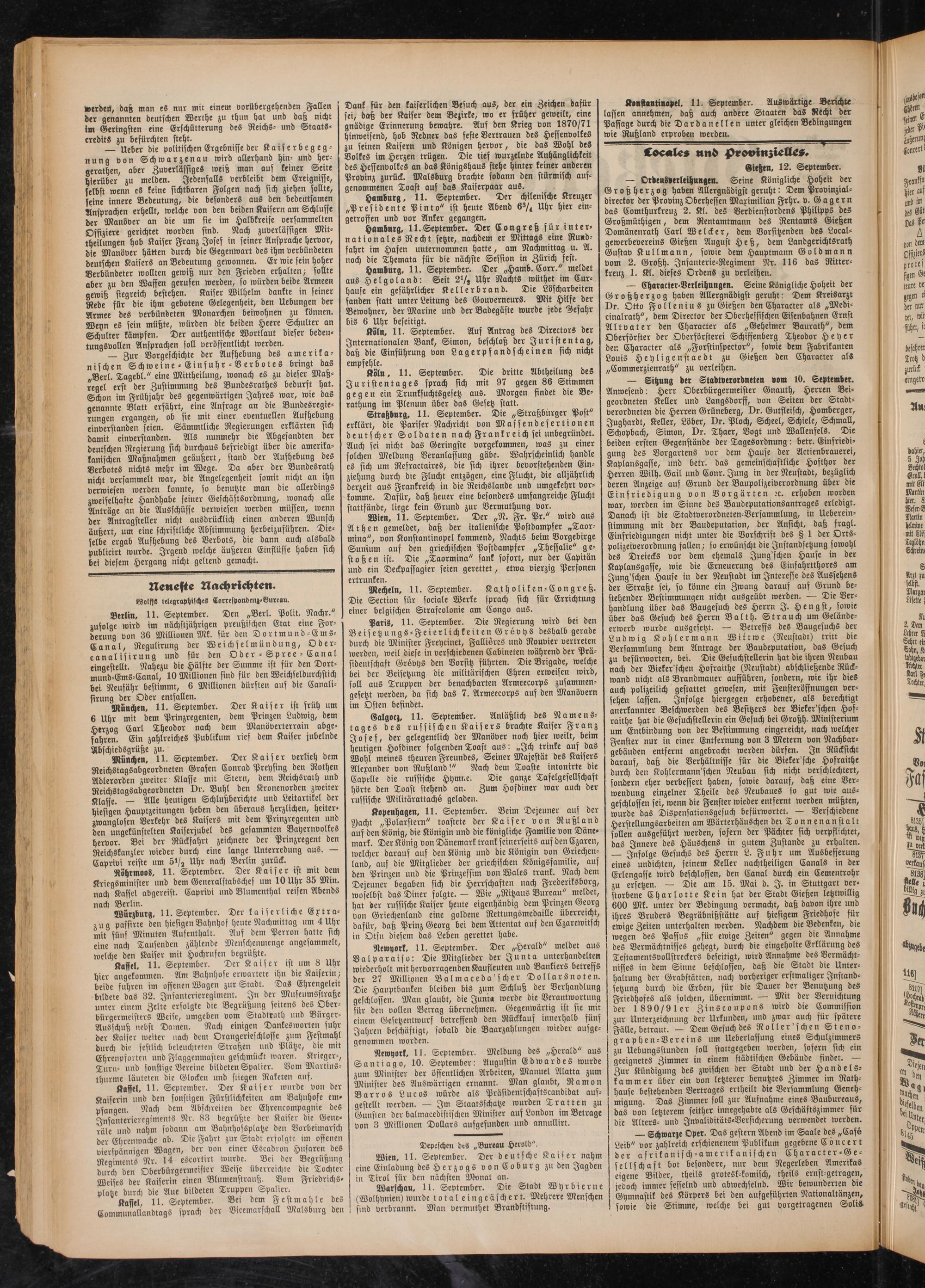 Kassel, 11. September. Der Kaiser ist um 8 Uhr hier angekommen. Am Bahnhofe erwartete ihn die Kaiserin - beide fuhren im offenen Wagen zur Stadt. Das Ehrengeleit bildete das 32. Infanterieregiment. In der Mufeumsstraße unter einem Zelte erfolgte die Begrüßung seitens des Oberbürgermeisters Weise, umgeben vom Stadtrath und Bürger- Ausschuß nebst Damen. Nach einigen Dankesworten suhr der Kaiser weiter nach dem Orangerieschlosse zum Festmahl durch die sestlich beleuchteten Straßen und Plätze, die mit Ehrenpforten und Flaggenmasten geschmückt waren. Krieger-, Turn- und sonstige Vereine bildeten Spalier. Vom Martins- thnrme läuteten die Glocken und stiegen Raketen auf.