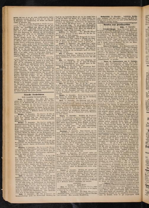 Würzburg, 11. September. Der kaiserliche Extra- zug passirte den hiesigen Bahnhof heute Nachmittag um 4 Uhr mit fünf Minuten Aufenthalt. Auf dem Perron hatte sich eine nach Tausenden zählende Menschenmenge angesammelt, welche den Kaiser mit Hochrusen begrüßte.