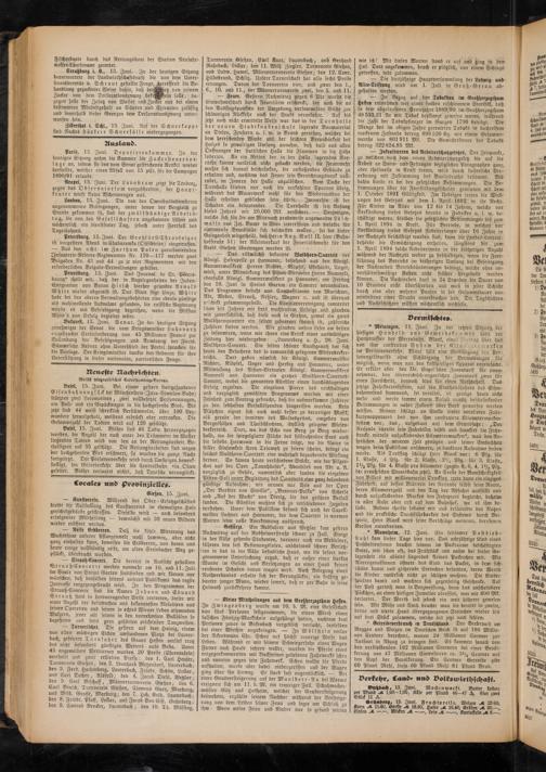 Basel, 15. Juni. Bei einem gestern stattgefundenen Eisenbahnunglück bei Mönchenstein (Jura-Simplon-Bahn) stürzten zwei Locomotiven, zwei vollbesetzte Personenwagen, ein Post- und ein Gepäckwagen in die hochgehende Birs. Bis jetzt sind 44 meist schrecklich Verstümmelte, über 100 Verwundete heraufgeholt, meistens erdrückt oder ertrunken. Die Gesammtzahl der Tobten wird aus 120 geschätzt.