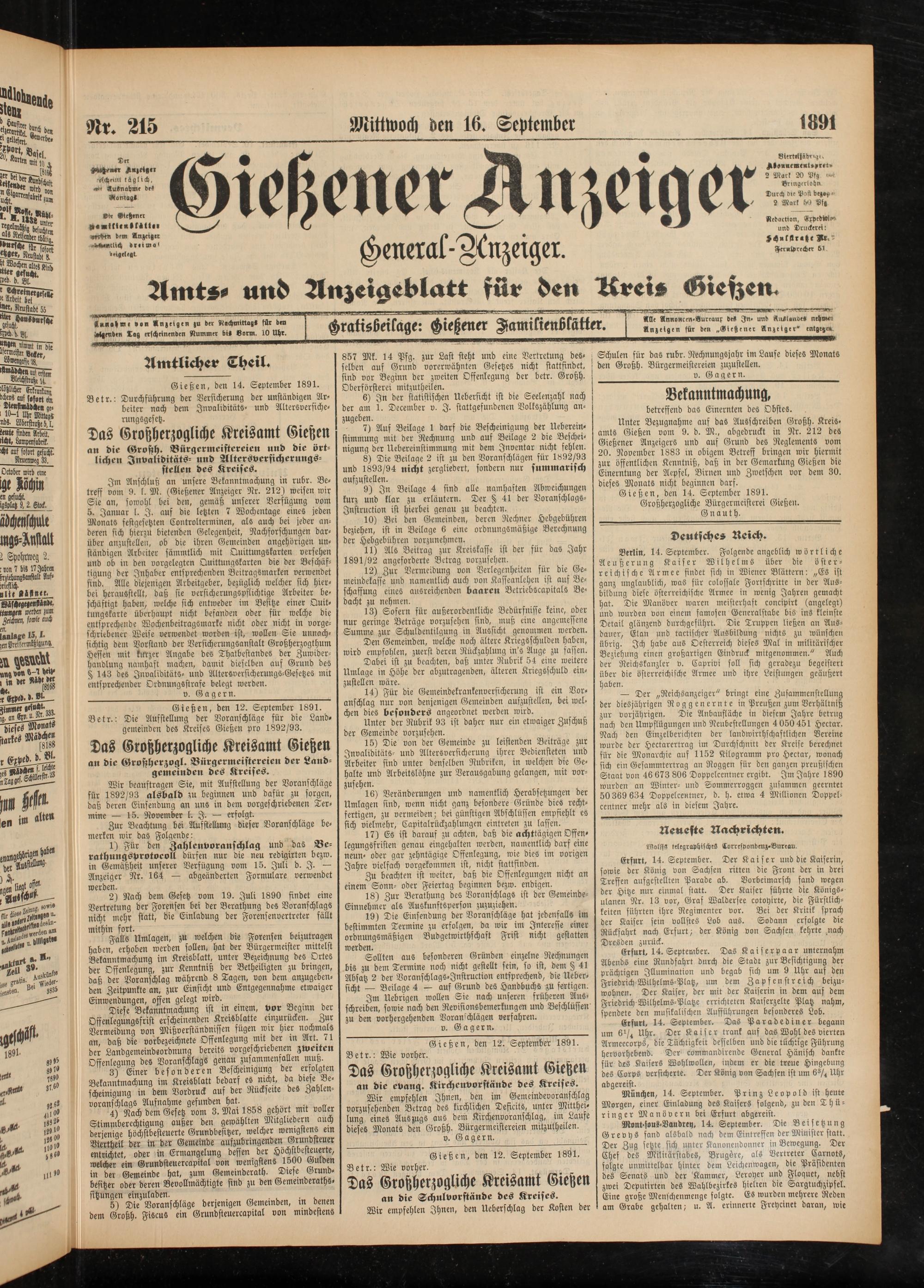 Gießen, den 14. September 1891. Betr.: Durchführung der Versicherung der unständigen Arbeiter nach dem Jnvaliditäts- und Altersversiche- mngsgesetz.
