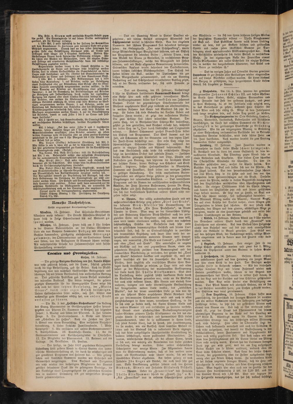 — Das am Sonntag, den 22. Februar, Nachmittags 5 Uhr im Clubsaate stattfindende Kammermusik Coucert bringt eine Reihe hier noch nicht gehörter interessanter Werke. Die Eröfsnungsnummer bildet das O-nroll-Trio von Johannes Brahms. Dieses der gegenwärtigen Schaffensperiode des Meisters angehörende Werk zeigt vielleicht am allerdeutlichsten, in welchen Rahmen das Genie des Künstlers sich jetzt bewegt. Es finden sich tiefe Gedanken bei klarster Arbeit und knappster Form vereint; es zeigt den vollendeten Meister. Die zwei Ecksätze sind achter männlicher Brahms. Der zweite Satz, der in Beethoven'scher Scherzo-Art dahinfliegt, gehört zu dem genialsten, was Brahms erdacht hat, während der dritte Satz im 5/4 Tact durch Sieblichkeit und Originalität erfreut. — Robert Schumanns großes V-moU-Trio bildet den Schluß des Programms. Das Werk stammt aus der Zeit, als Schumann mit der Genoveva und dem letzten Theil der Faust-Scene beschäftigt war. Der erste Satz trägt den schwermüthigen Schumann'schen Character, während der zweite in einziger Frische und Rhytmik dahinrauscht. Auf das dem Verständniß nicht leicht sich erschließende Adagio folgt im herrlichsten D-dur das jubelnde Finale. — Zwischen diesen Werken gelangen Claviersoli von Siszt, Chopin und Rubinstein zum Vortrag, von letzterem die berühmte Etüde mit falschen Noten; ferner Gesänge von Schubert und Ernst Franck. Letzterer, früher Hofcapellmeister in Mannheim, Hannover und Frankfurt, starb leider vor wenigen Jahren in geistiger Umnachtung. Die frisch empfundenen Rattenfängerlieder mit obligater Geige gehören zu den gelungensten Eingebungen des talentvollen Künstlers. — Das interessante Programm und die Namen der ausführenden wohlaccreditirten Künstler, der Frau Florence Bassermann, Herren Dr. Ganz, Hugo Becker und Fritz Bassermann versprechen großen Genuß, den sich das kunstliebende Publikum unserer Stadt nicht entgehen lassen möge.