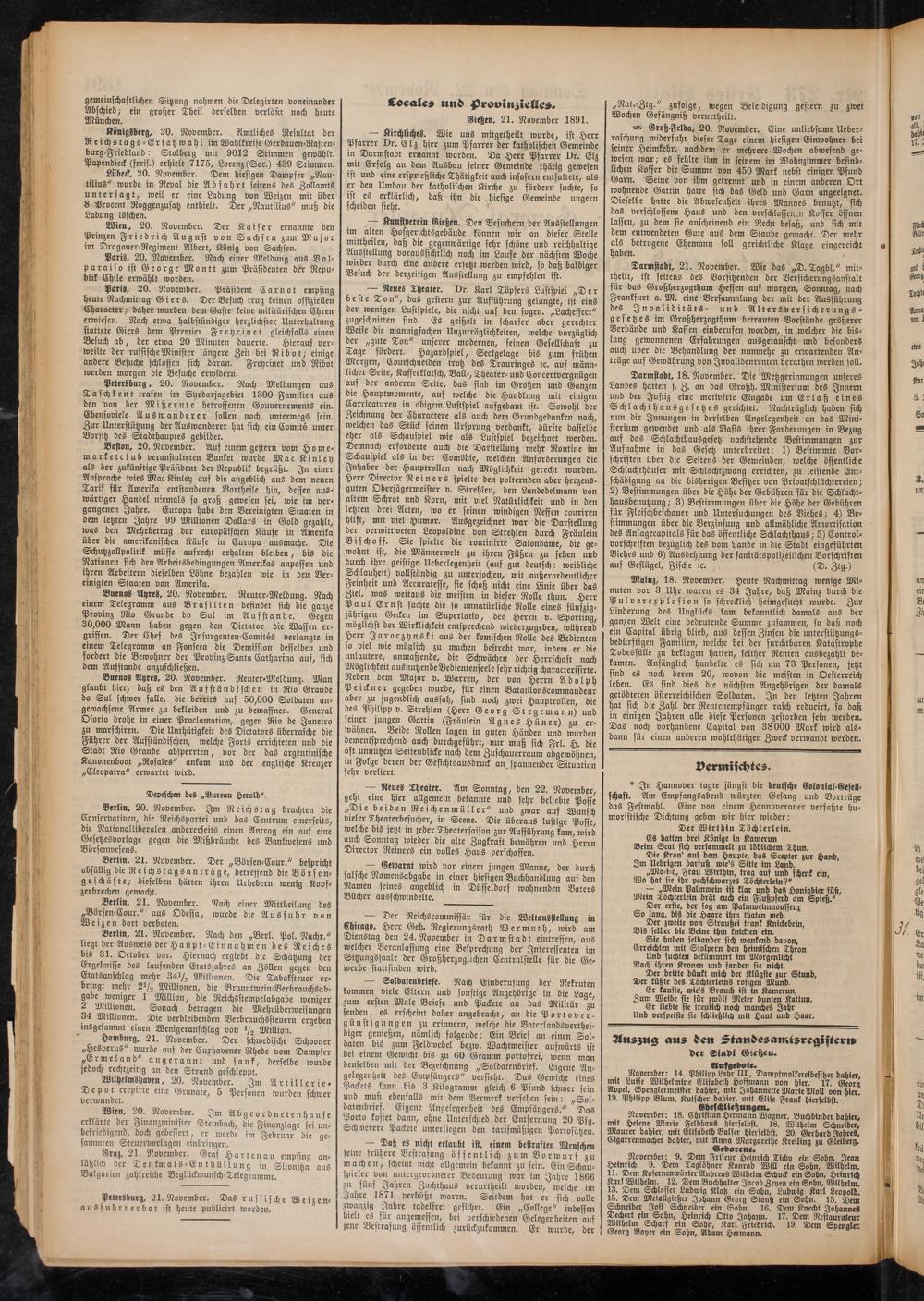 Der Reichscommissär für die Weltausstellung in Chicago, Herr Geh. Regierungsrath Wermuth, wird am Dienstag den 24. November in Darmstadt eintreffen, aus welcher Veranlassung eine Besprechung der Interessenten im Sitzungssaale der Großherzoglichen Centralstelle für die Gewerbe stattfinden wird.