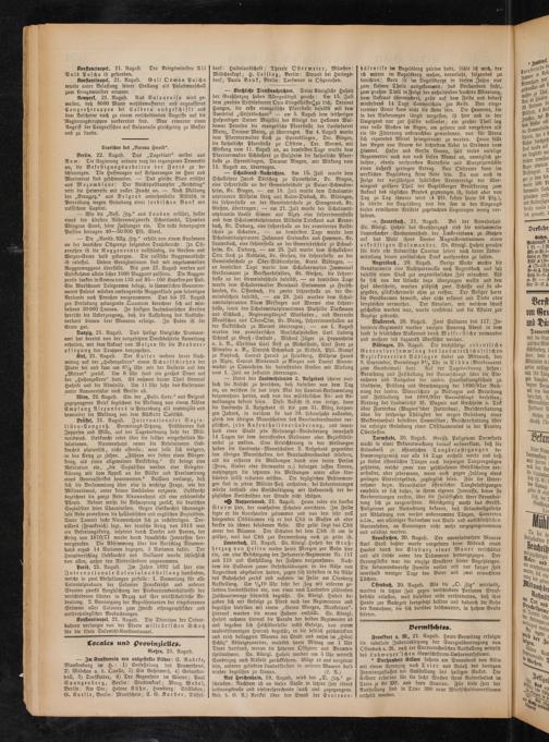 Berlin, 22. August. Das „Tageblatt" meldet aus Rom: Die Regierung ordnete trotz der ergangenen Dementis an, die Befestigungsarbeiten der Forts zu beschleunigen. Die Hoffnungen auf Ersparungen im Heer und Marineetat sind geschwunden. — Das gleiche Blatt erfährt aus Mozambique: Der Reichspostdampfer „Reichstag" tritt die Heimreise mit voller Fracht an. — Nach Meldung der „Kreuzztg." aus Belgrad unterhandelte Ristitsch in Petersburg wegen Gründung einer serbischen Bank mit russischem Capital.