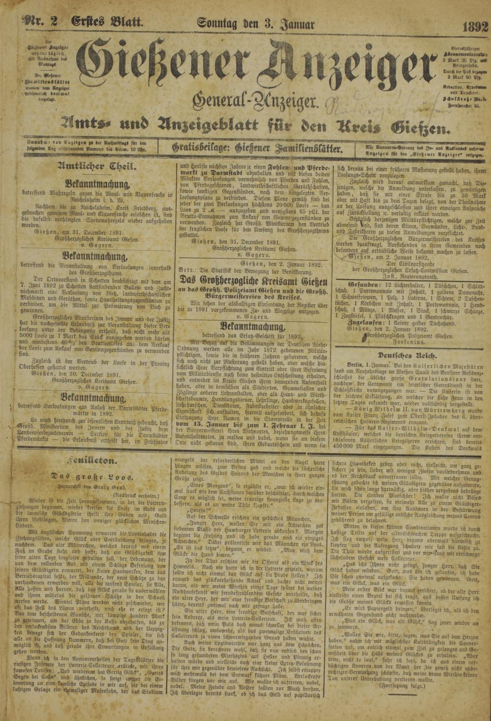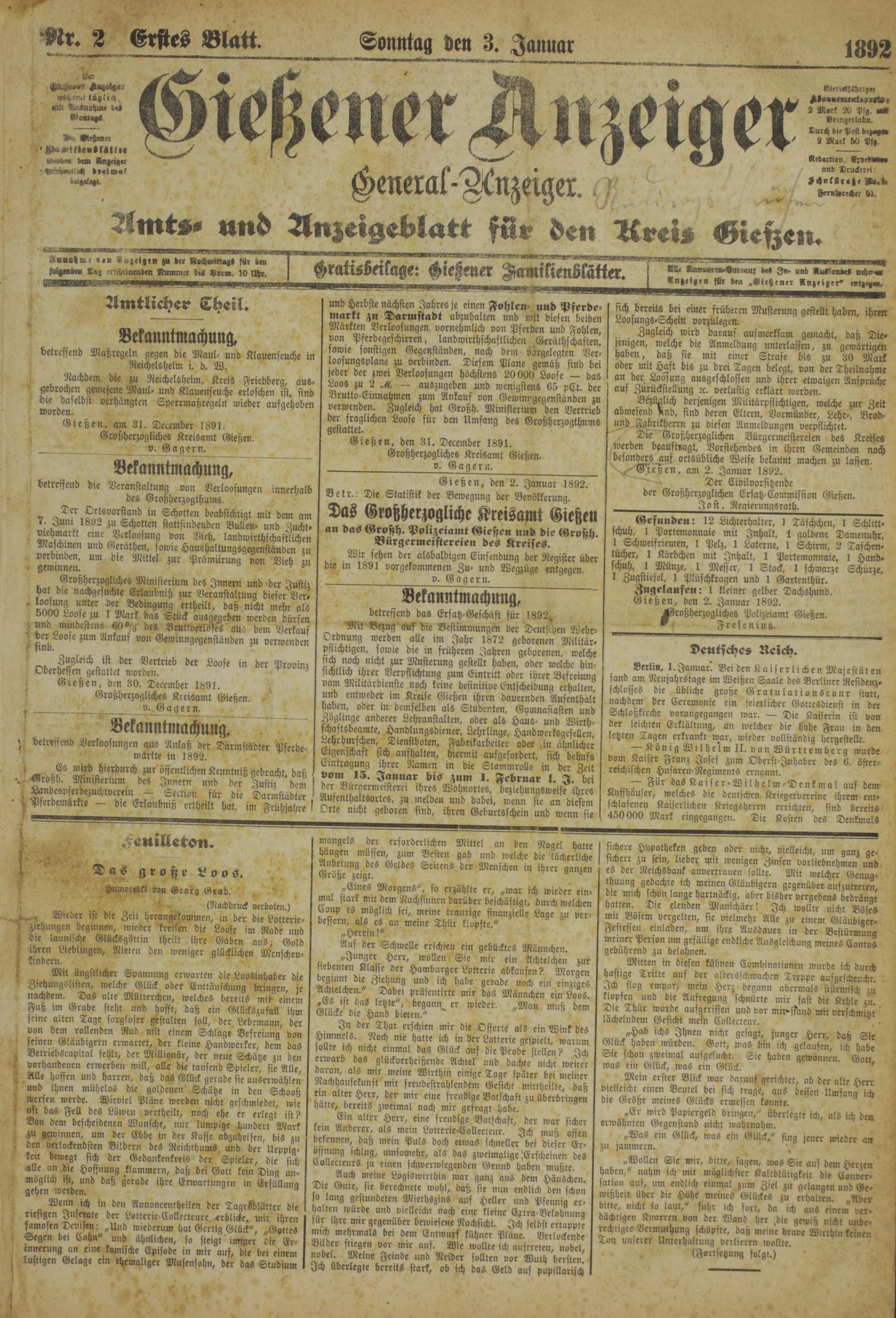 Gießen, den 2. Januar 1892. Betr.: Die Statistik der Bewegung der Bevölkerung. Das Großherzagliche Kreisamt Gießen an das Großh. Polizeiamt Gießen und die Großh. Bürgermeistereien des Kreises.