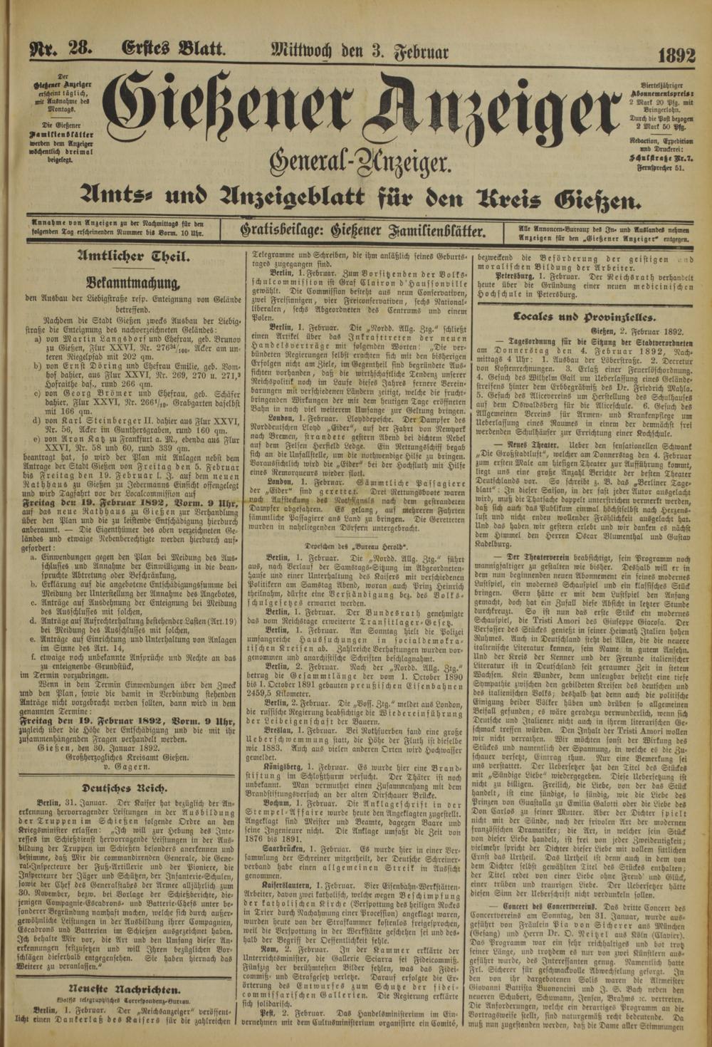 Freitag deu 19. Februar 1892, Vorm. 9 Uhr, auf das neue Rath Haus zu Gießen zur Verhandlung , über den Plan und die zu leistende Entschädigung hierdurch anberaumt. — Die Eigenthümer des oben verzeichneten Geländes und etwaige Nebenberechtigte werden hierdurch aufgefordert :