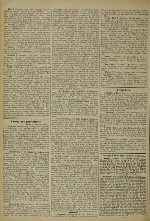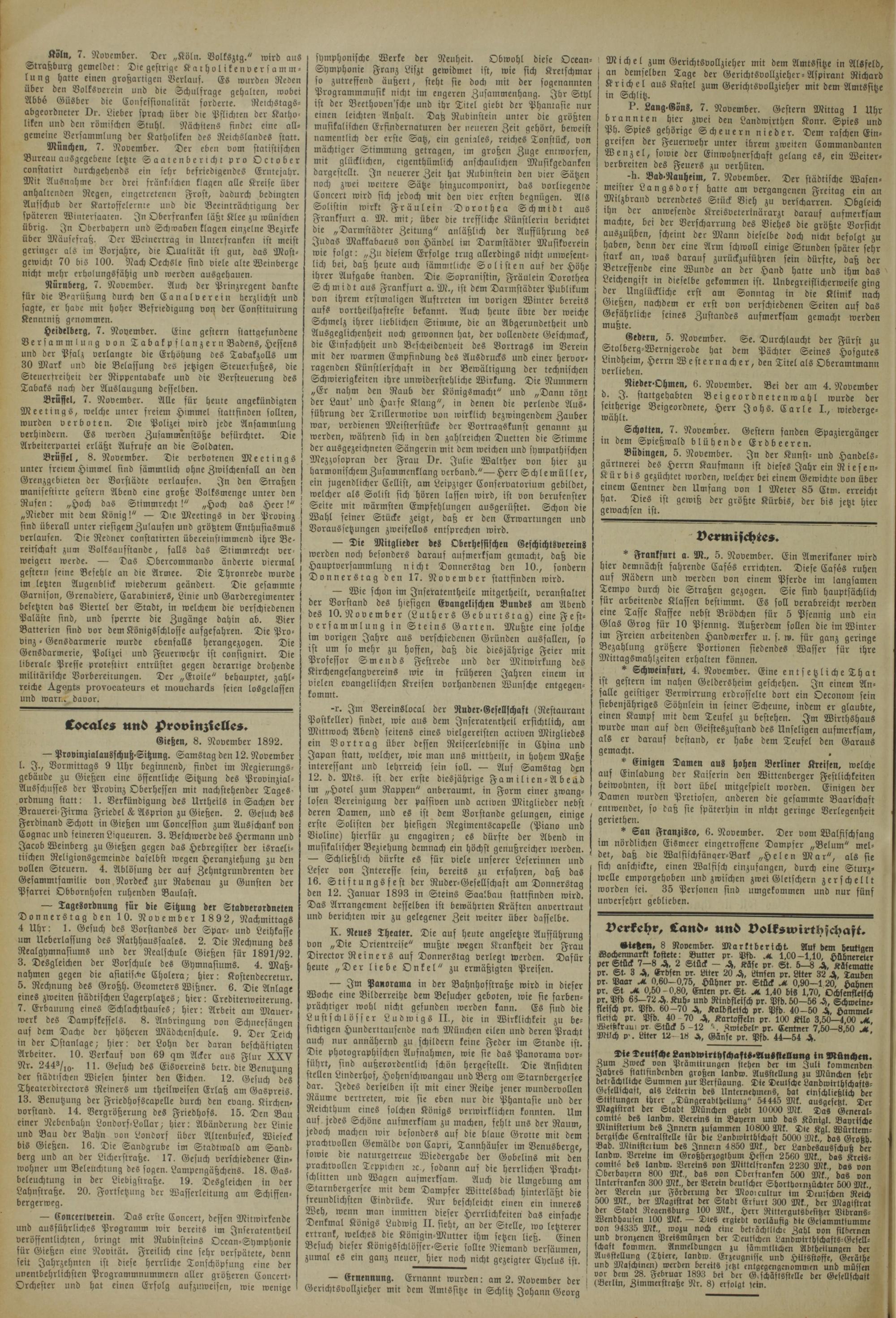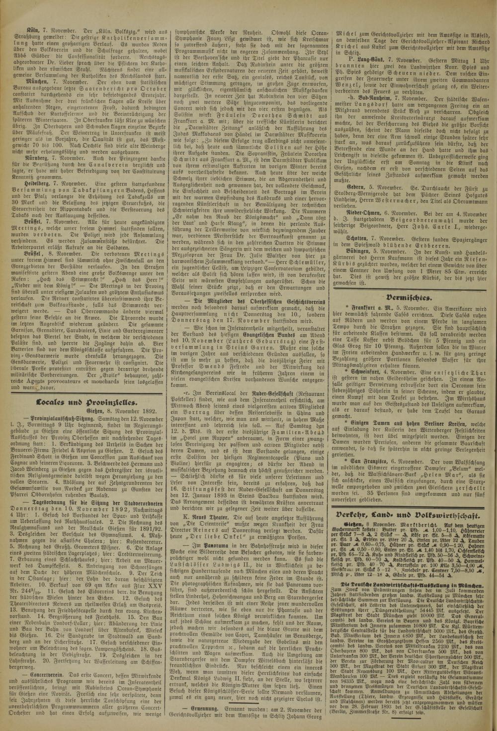 — Tagesordnung für die Sitzung der Stadverordneten Donnerstag den 10. November 1892, Nachmittags 4 Uhr: 1. Gesuch des Vorstandes der Spar- und Leihkasse um Ueberlassung des Rathhaussaales. 2. Die Rechnung des Realgymnasiums und der Realschule Gießen für 1891/92. 3. Desgleichen der Vorschule des Gymnasiums. 4. Maßnahmen gegen die asiatische Cholera- hier: Kostendecretur. 5. Rechnung des Großh. Geometers Wißncr. 6. Die Anlage eines zweiten städtischen Lagerplatzes- hier: Crediterweiterung. 7. Erbauung eines Schlachthauses- hier: Arbeit am Mauerwerk des Dampfkessels. 8. Anbringung von Schneefängen aus dem Dache der höheren Mädchenschule. 9. Der Teich in der Ostanlage- hier: der Lohn der daran beschäftigten Arbeiter. 10. Verkauf von 69 qm Acker aus Flur XXV Nr. 2443/10. 11. Gesuch des Eisvereins betr. die Benutzung der städtischen Wiesen hinter den Eichen. 12. Gesuch des Theaterdirectors Reiners um theilweisen Erlaß am Gaspreis. 13. Benutzung der Friedhosscapelle durch den evang. Kirchenvorstand. 14. Vergrößerung des Friedhofs. 15. Den Bau einer Nebenbahn Londorf-Lollar- hier: Abänderung der Linie und Bau der Bahn von Londorf über Altenbuseck, Wieseck bis Gießen. 16. Die Sandgrube im Stadtwald am Sandberg und an der Licherstraße. 17. Gesuch verschiedener Einwohner um Beleuchtung des sogen. Lampengäßchens. 18. Gasbeleuchtung in der Liebigstraße. 19. Desgleichen in der Lahnstraße. 20. Fortsetzung der Wasserleitung am Schiffen- bergerweg.