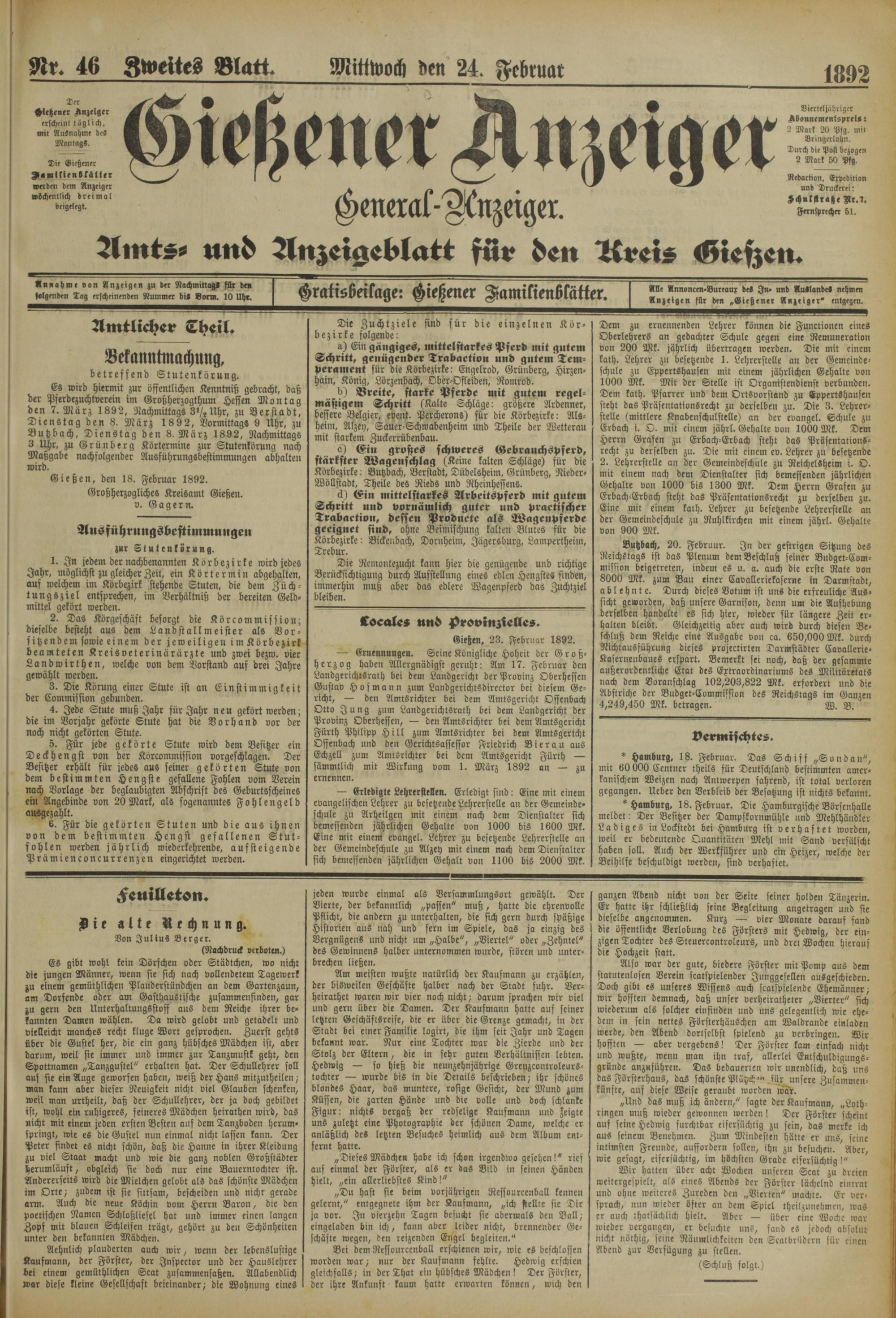 Es wird hiermit zur öffentlichen Kenntniß gebracht, daß der Pferdezuchtverein im Großherzogthum Hessen Montag den 7. März 1892, Nachmittags 3*/zUhr, zu Berstadt, Dienstag den 8. März 18 9 2, Vormittags 9 Uhr, zu Butzbach, Dienstag den 8. März 1892, Nachmittags 3 Uhr, zu Grünberg Körtermine zur Stutenkörung nach Maßgabe nachfolgender Ausführungsbestimmungen abhalten wird.