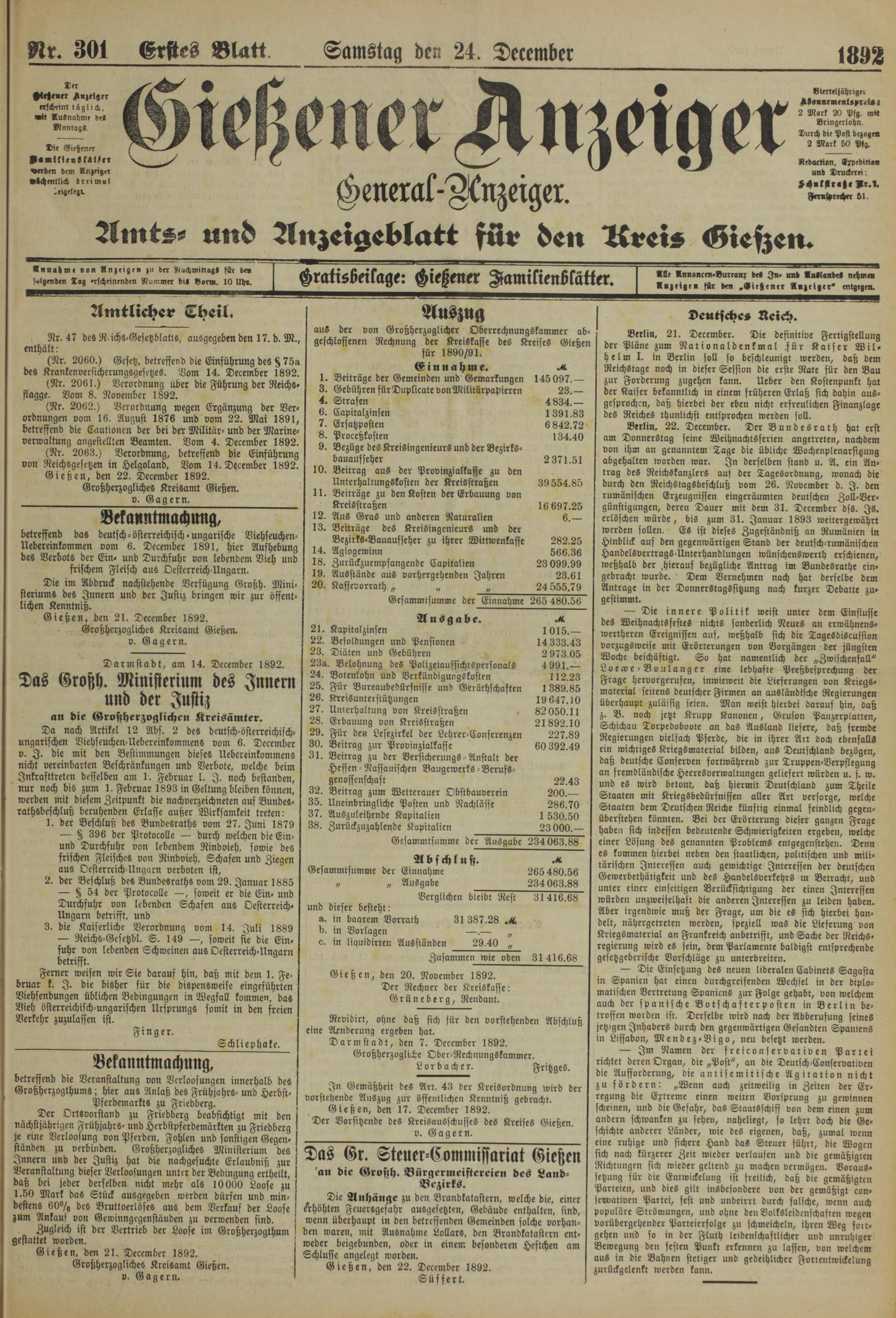 Nr. 301 Erstes Blatt Samstag den 24. December