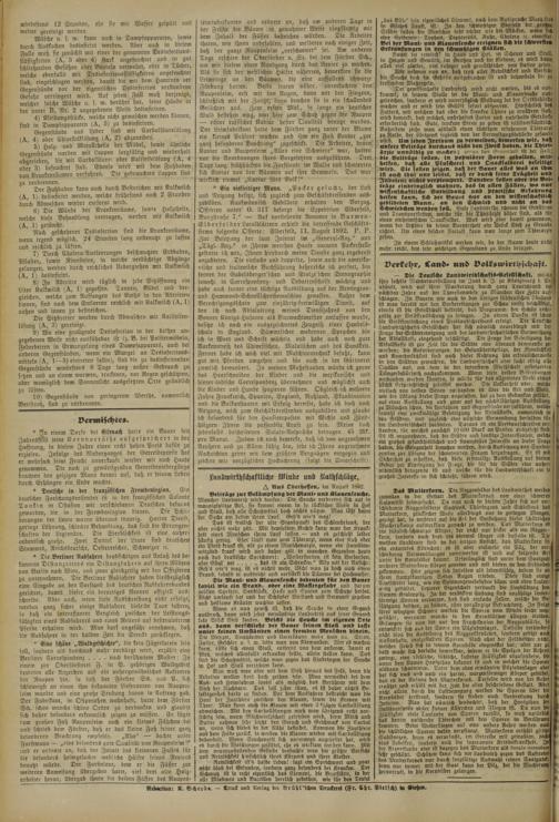 9) Wo eine genügende Desinfection in der btkher angegebenen Weise nicht ausführbar ist (z. B. bei Polstermöbeln, Federbetten in Ermangelung eines Dampsapparats, auch bei anderen Gegenständen, wenn ein Mangel an Desinfections- mitteln (A, 1—5) eintreten sollte), sind die zu desinficirenden Gegenstände mindestens 6 Tage lang außer Gebrauch zu setzen und an einem warmen, trockenen, vor Regen geschützten, aber womöglich dem Sonnenlicht ausgesetzten Orte gründlich zu lüsten.