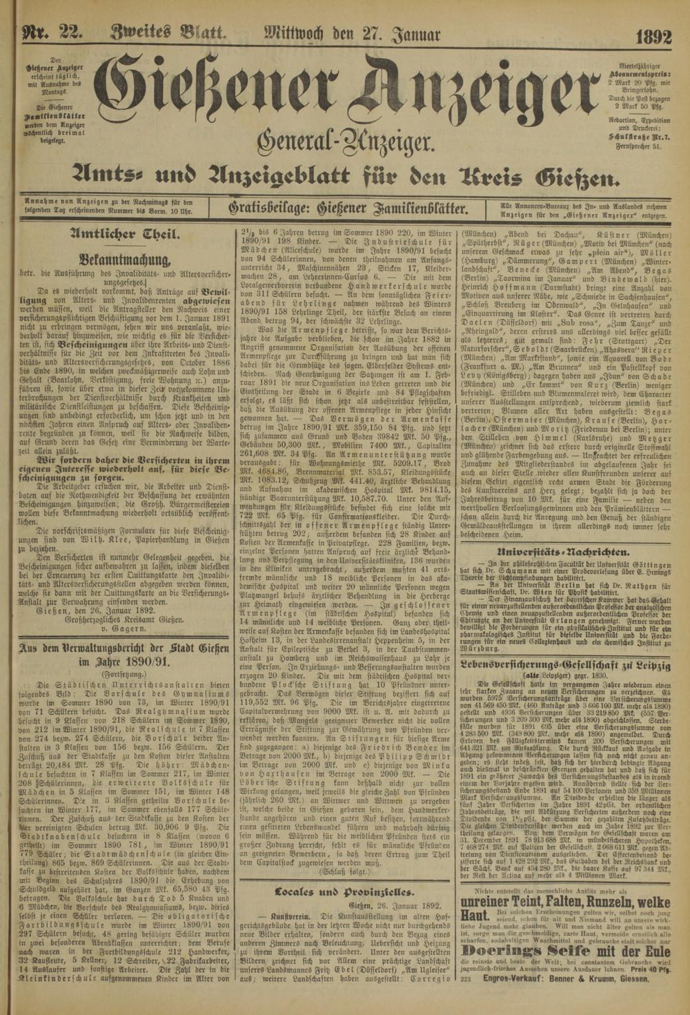 Gießen, den 26. Januar 1892. Großherzogliches Kreisamt Gießen, v. Gagern.