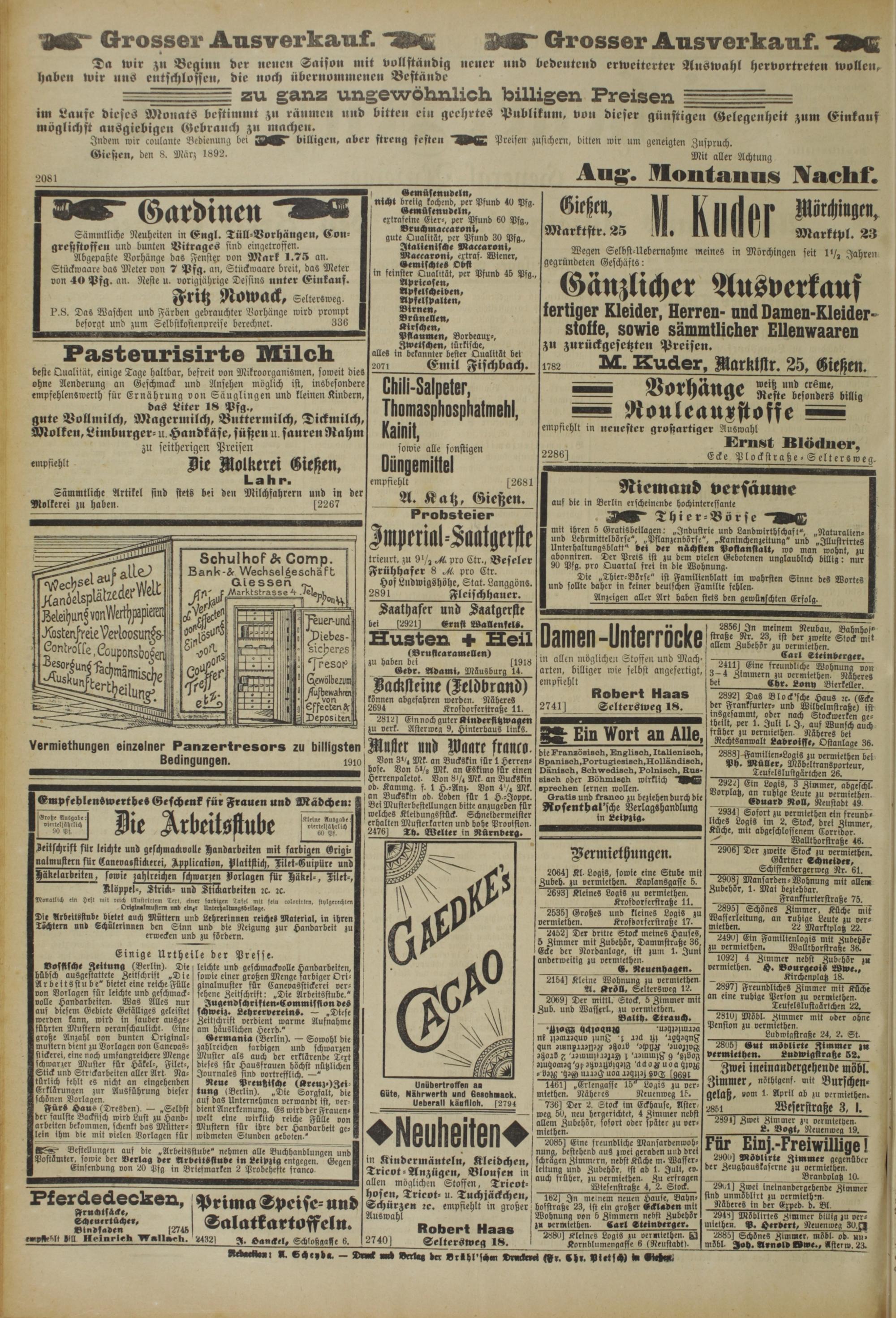 1092] 4 Zimmer nebst Zubchör zu vermiethen. H. Bourgeois Wwe., ____Kirchenplatz 18.