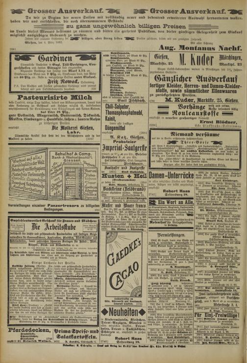 Abgepaßte Vorhänge das Fenster von Mark 1.75 an. Stückwaare das Meter von 7 Pfg. an, Stückwaare breit, das Meter von 40 Pfg. an. Neste u. vorigjührige Dessins unter Einkauf.
