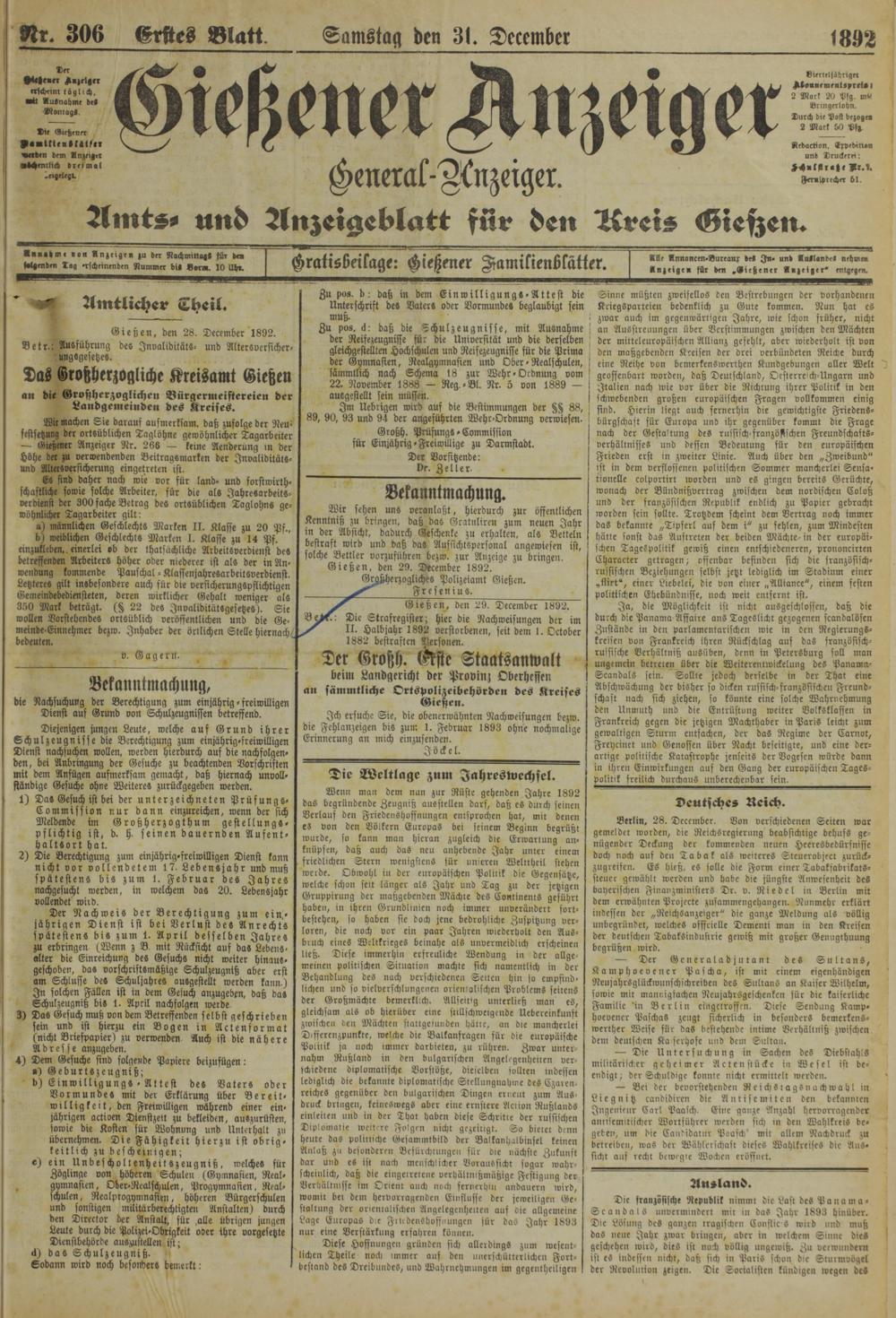 Die französische Republik nimmt die Last des Panama- Sc an dal s unvermindert mit in daS Jahr 1893 hinüber. Die Lösung des ganzen tragischen Conflic s wird und muß das neue Jahr zwar bringen, aber in welchem Sinne dies geschehen wird, dies ist noch völlig ungewiß. Zu verwundern ist es indessen nicht, daß sich in Paris schon die Sturmvögel der Revolution zeigen. Die Socialisten kündigen wegen des