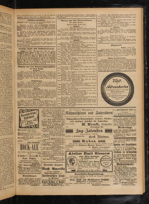 März: 26. Dem CorpSdlener Wilhelm Müller eine Tochter, Luise Hermine Elisabeth. 27. Dem Kaufmann Julius Klipstein ein Sohn. 29. Dem Graveur Max Rühl eine Tochter, Mathilde Christine Bei tha Elise. 30. Dem Schuhmachermeister Ludwig Wtedmeyer eine Tcckter, Hedwig Carola Luise. April: 1. Dem Schneider Heinrich Jahn ein Sohn. 2. Dem Handelsmann Isaak Walldorf ein Sohn, Oskar. 3. Dem Fiaschenbierhändler Christoph Gans ein Sohn.