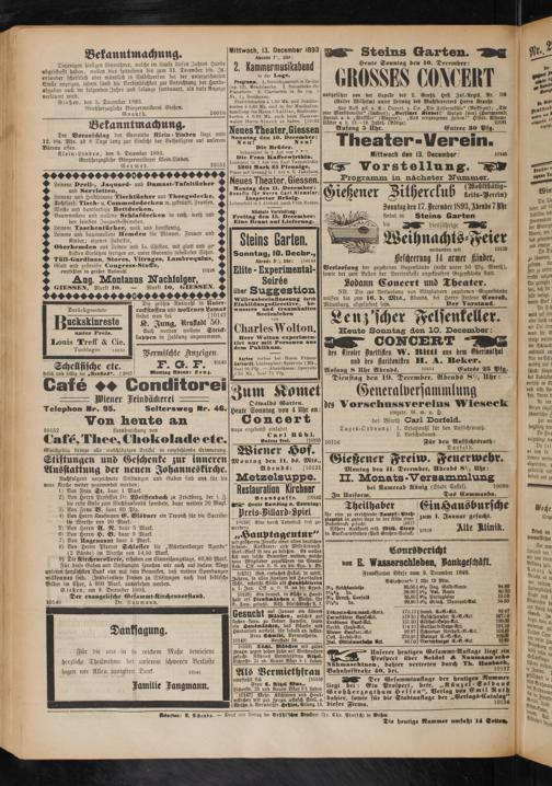 Eintrittskarten ä 1.50 Mk. und Schülerkarten k 0.60 Mk. sind in der Musikalienhandlung des Herrn C'hallier, Studentenkarten k 0.60 Mk. auch beim Hausverwalter Herrn Storck zu haben. [10132 Neues Theater, Giessen Sonntag den 10. December: