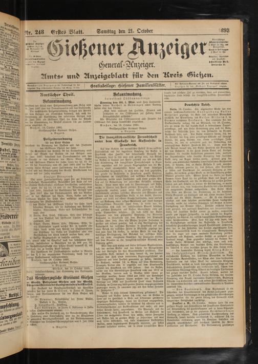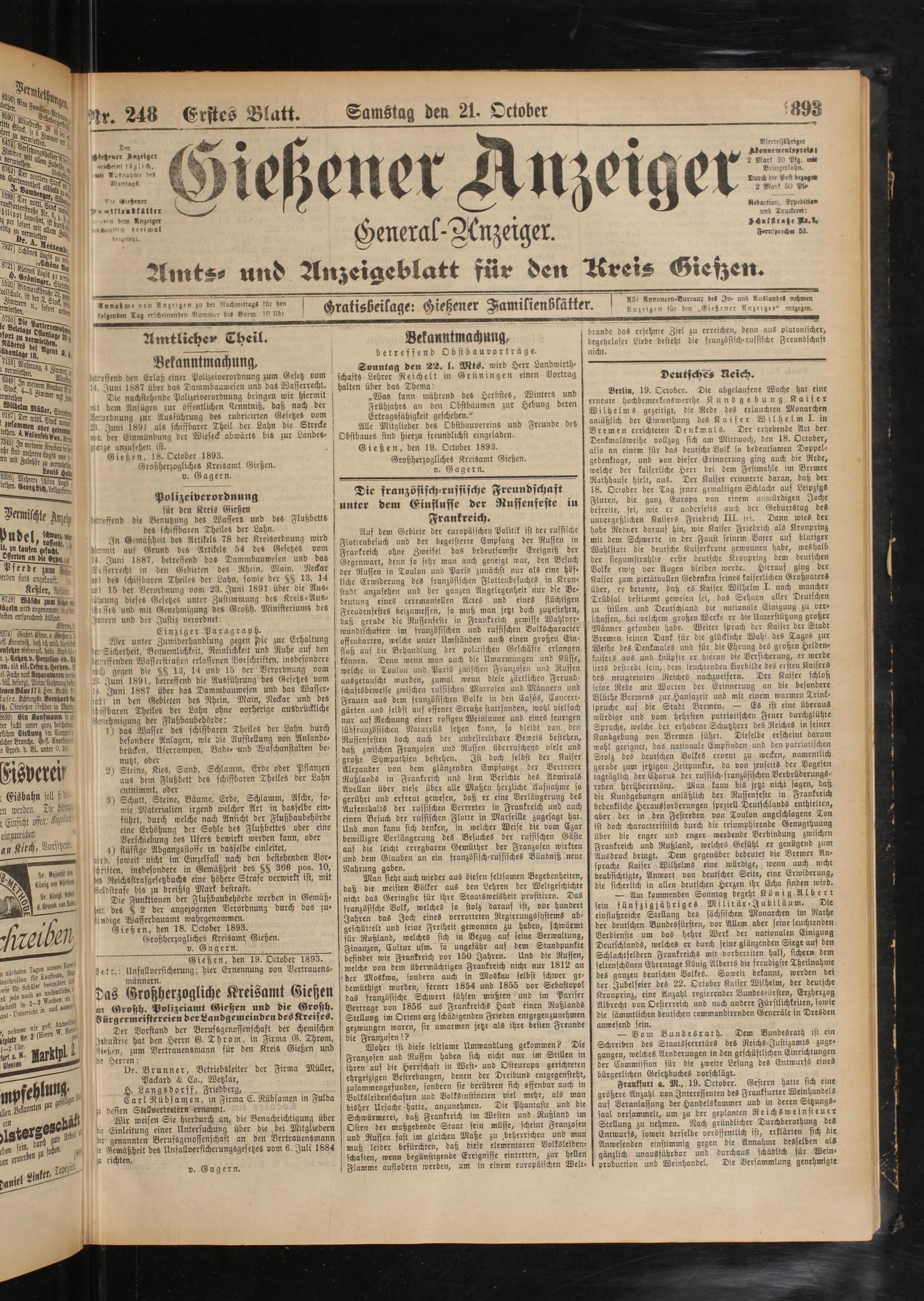 Gießen, den 19. October 1893. GroßherzoglicheS Kreisamt Gießen, v. Gagern.