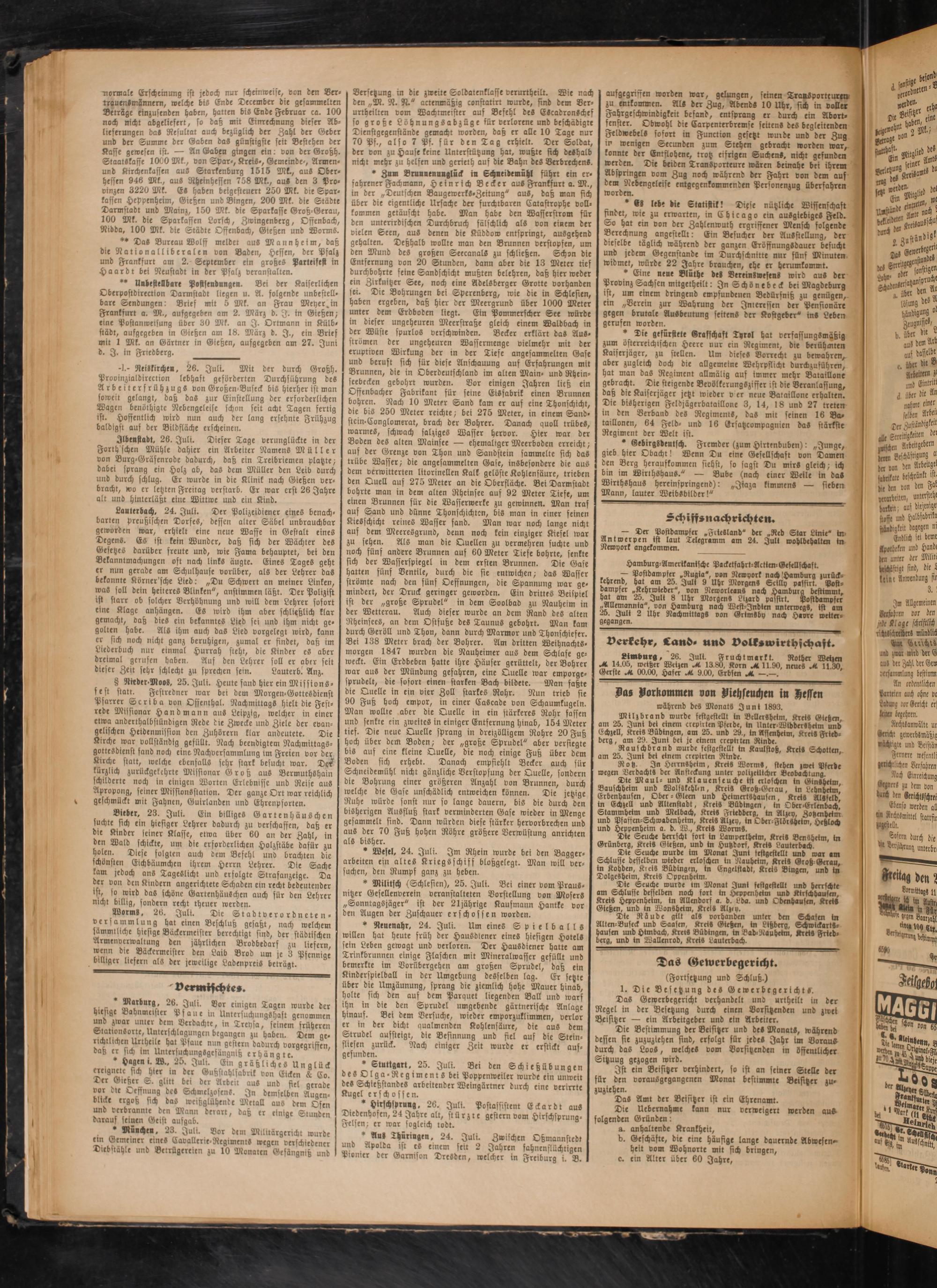 WormS, 26. Juli. Die Stadtverordneten- Versammlung hat einen Beschluß gefaßt, nach welchem sämmtliche hiesige Bäckermeister berechtigt sind, der städtischen Armenvcrwaltung den jährlichen Brodbedars zu liefern, wenn bte Bäckermeister den Laib Brod um je 3 Pfennige billiger liefern als der jeweilige Ladenpreis beträgt.