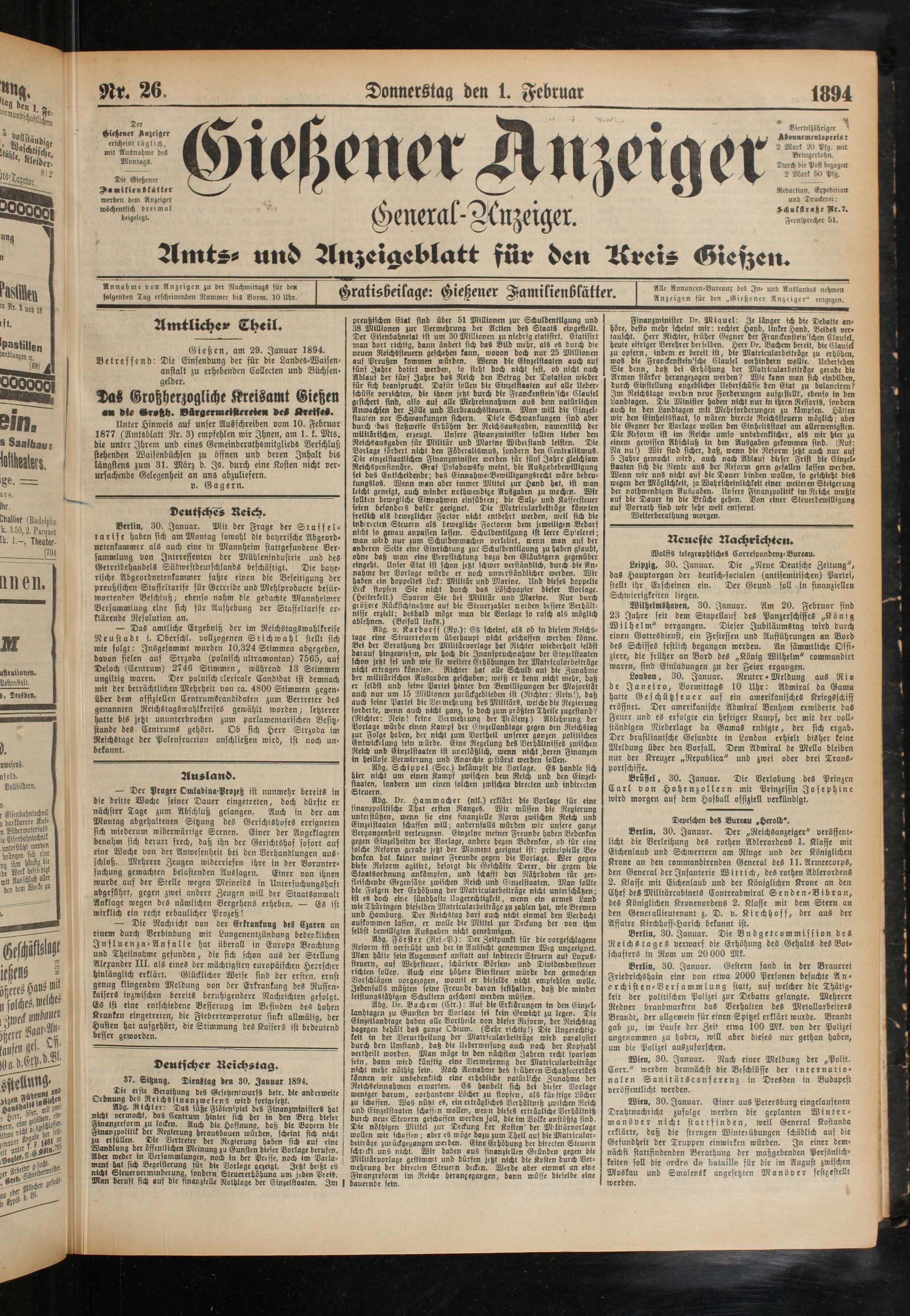 37. Sitzung. Dienstag den 30. Januar 1894.