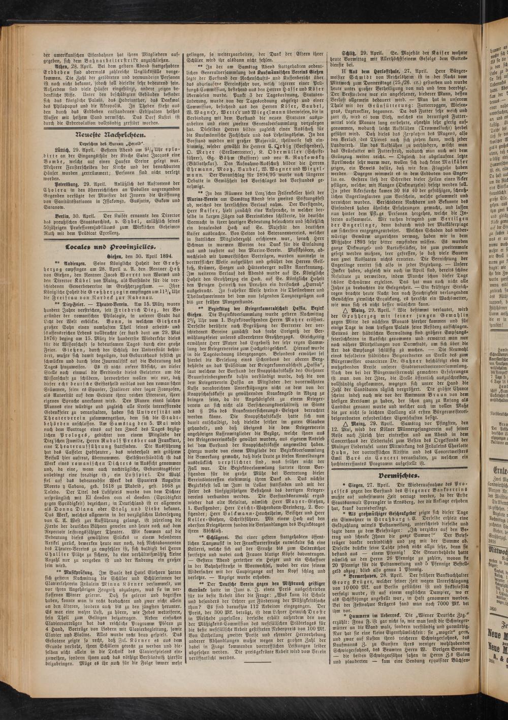 Lattich, 29. April. Gestern Abend um 9^Uhr eplo- dirte an der EingangSthür der Kirche Saint Jacques eine Bombe, welche auf einen Haufen Steine gelegt war. Mehrere Fensterscheiben der Kirche und der benachbarten Häuser wurden zertrümmert- Personen sind nicht verletzt worden.