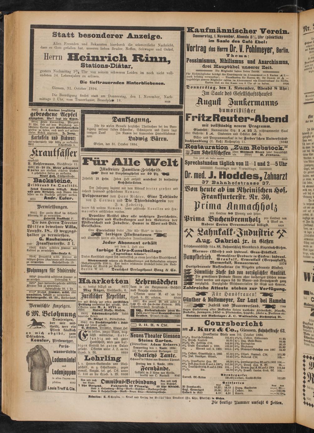 (Direction: Adam Reiners.) Donnerstag den 1. Novbr. 1894: — Aus allgemeines Verlangen: — Charleys Tante.