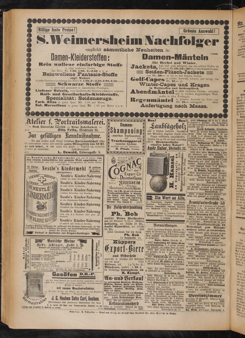 ; r/e , ' V '/Rheingau i W erkanntfeinste/Marke. Preis: von 2 Mk. ab per Literflasche. VerkantssteUen in Glessen : Cbr. Bieker, Phil. Herrmann, Fritz Lony Nachf., Ludw Loth, EmllOrbig, Otto Schaaf, Gustav Walther; In Wleeeok: Heb. Voelzel II. [5572