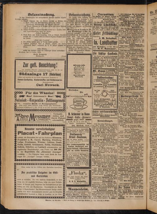 Neuester vervollständigter e Placat - Fahrplan | enthalt, die Fahrzeiten der auf den Stationen Giessen, W Frankfurt a. M., Cassel, Marburg, Friedberg, M Lollar, Fronhausen, Wetzlar, Coblenz, Deutz, ® Fulda, Alsfeld, Gelnhausen, Nidda, Stockheim, S Gedern, Schotten und Laubach ankommenden und ä abgehenden Eisenbahnzüge, zum Preise von 20 Pf. I in der Expedition des „Giessener Anzeiger“ ® vorräthig. — Der Fahrplan kann auch durch die Aus- ® träger des „Anzeiger“ bezogen werden. V
