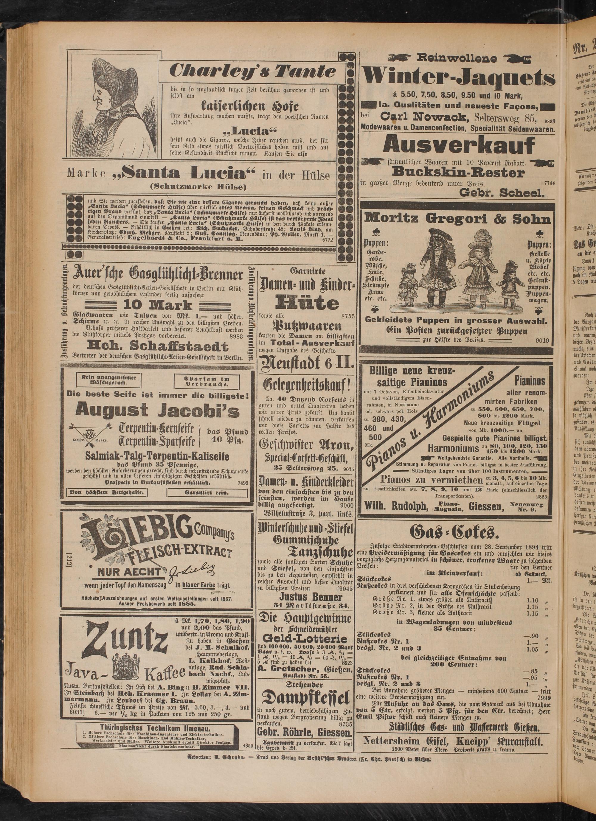 Infolge Stadtverordneten - Beschlusses vom 28. September 1894 tritt eine Preisermäßigung für Gascokes ein und empfehlen wir dieses vorzügliche Heizungsmaterial in schöner, trockener Maare zu folgenden Preisen: für den Gentner