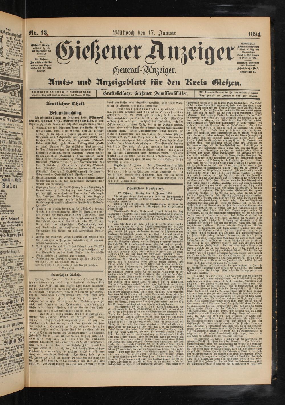 Festsetzung des Kre'skasse-Voranschlags für 1894/95. Gießen, den 13. Januar 1894.