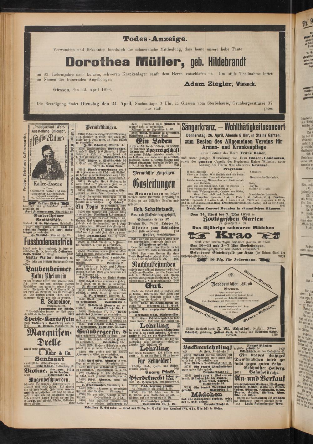 Die Beerdigung findet Dienstag den 24. April, Nachmittags 3 Uhr, in Giessen vom Sterbehause, Grünbergerstrasse 37