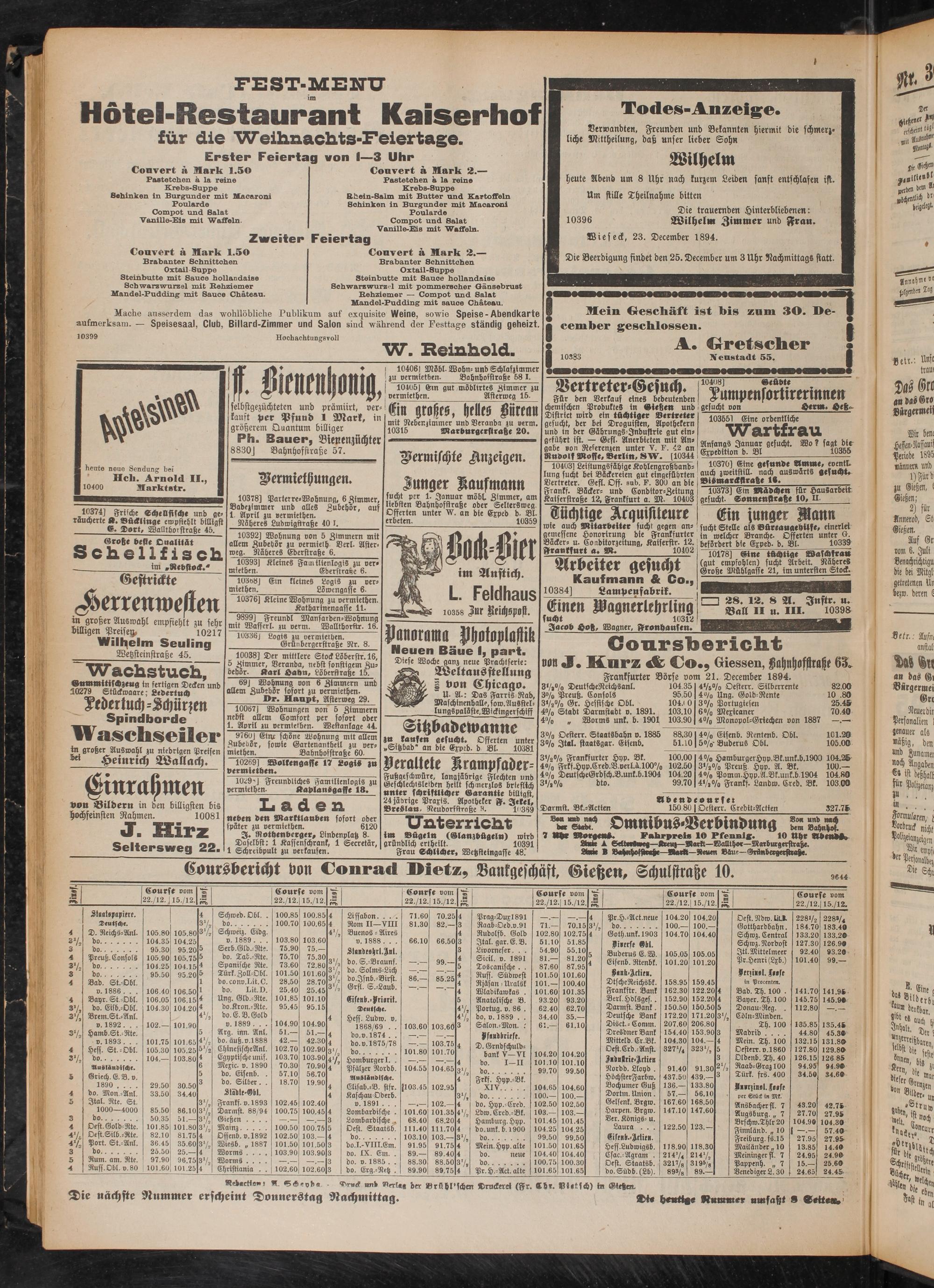 Mache ausserdem das wohllöbliche Publikum auf exquisite Weine, sowie Speise-Abendkarte aufmerksam. — Speisesaal, Club, Billard-Zimmer und Salon sind während der Festtage ständig geheizt.