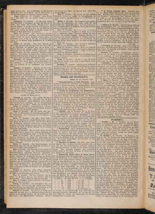 A Mainz, 27. December. Der Maschinenführer des während der Feiertage hier vor Anker gelegenen holländischen Dampfers „Emma, Königin der Niederlanden", Martin Cälois aus Amsterdam, erlitt gestern Nachmittag einen grauenvollen Tod. Derselbe wurde von der Kolbenstange der Maschine erfaßt und ihm die Hirnschale total zerschmettert, so daß der Tod sofort eintrat. — Die hiesigen Stadtverordneten haben heute Abend — einen vor 14 Tagen gefaßten Beschluß cassirend — beschloffen, die „Stadthalle" dem Carnevalsverein „Narrhalla" gegen die übliche Miethe von Mk. 7000 während der nächsten Caruevalsaison zu überlassen. Bei dem vor 14 Tagen gefaßten Beschluß war bedingt worden, daß der Stadtkaffe auch die Hälfte aus der Einnahme von dem Maskenballe zufließen solle, welche Bedingung in gewissen Kreisen eine arge Aufregung verursacht und man sich daher zur Aufhebung bereglen Beschlusses veranlaßt gesehen hat. — Die Einfuhr inländischer Weine in hiesiger Stadt hat in letzter Zeit außerordentlich zugenommen. Dieselbe betrug im verflossenen November 14,490 Hectoliter, mehr als das Doppelte von der Einfuhr in dem gleichen Monat des Vorjahres, indem im November 1893 nur 6489 Hectoliter eingeführt wurden.