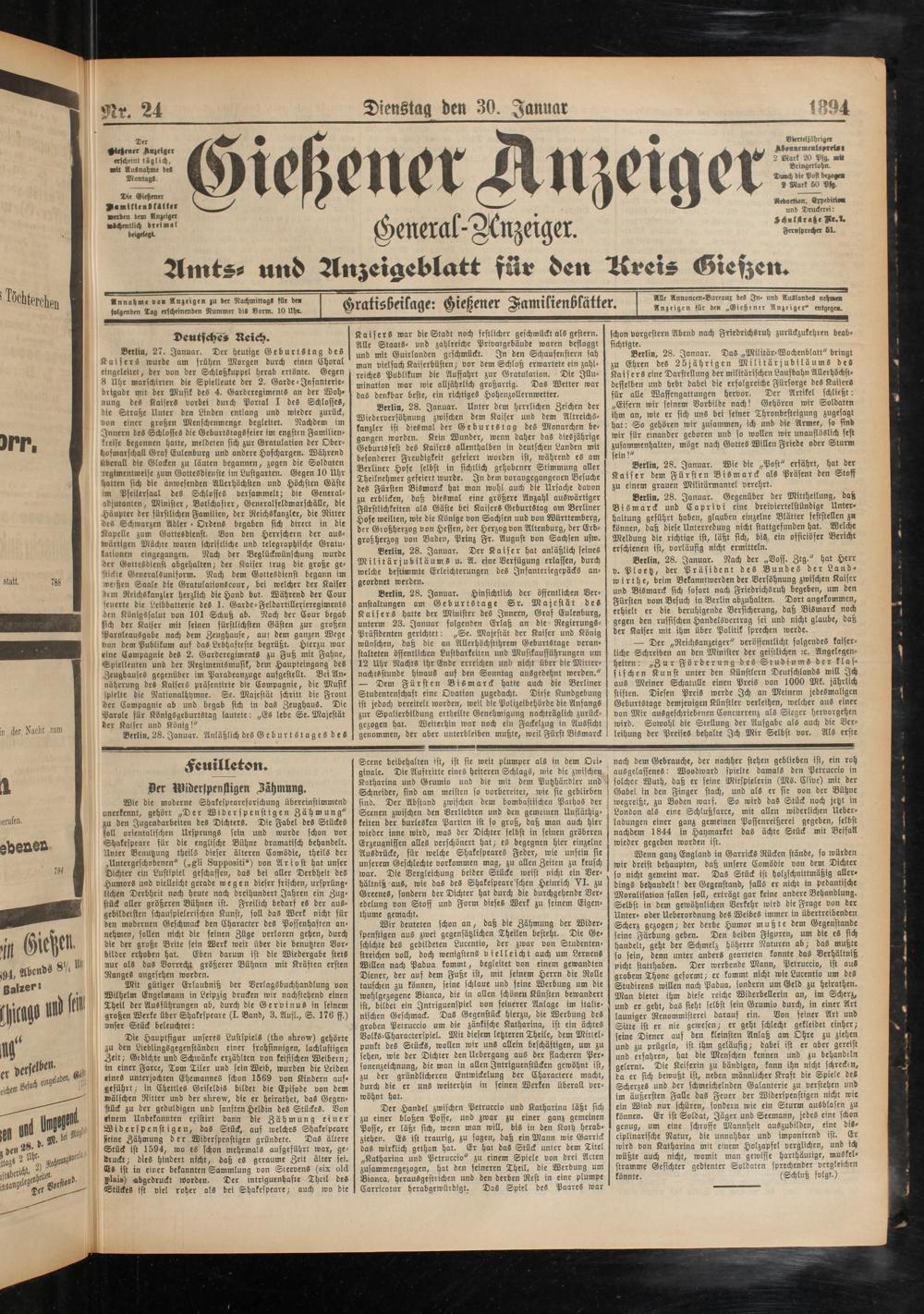 Berlin, 28. Januar. Unter dem herrlichen Zeichen der Wiederversöhnung zwischen dem Kaiser und dem Altreichskanzler ist diesmal der Geburtstag des Monarchen begangen worden. Kein Wunder, wenn daher das diesjährige Geburtsfest des Kaisers allenthalben in deutschen Landen mit besonderer Freudigkeit gefeiert worden ist, während es am Berliner Hofe selbst in sichtlich gehobener Stimmung aller Theilnehmer gefeiert wurde. In dem vorangegangenen Besuche des Fürsten Bismarck hat man wohl auch die Ursache davon zu erblicken, daß diesmal eine größere Anzahl auswärtiger Fürstlichkeiten als Gäste bei Kaisers Geburtstag am Berliner Hofe weilten, wie die Könige von Sachsen uud von Württemberg, der Großherzog von Heffen, der Herzog von Altenburg, der Erb- großherzog von Baden, Prinz Fr. August von Sachsen usw.