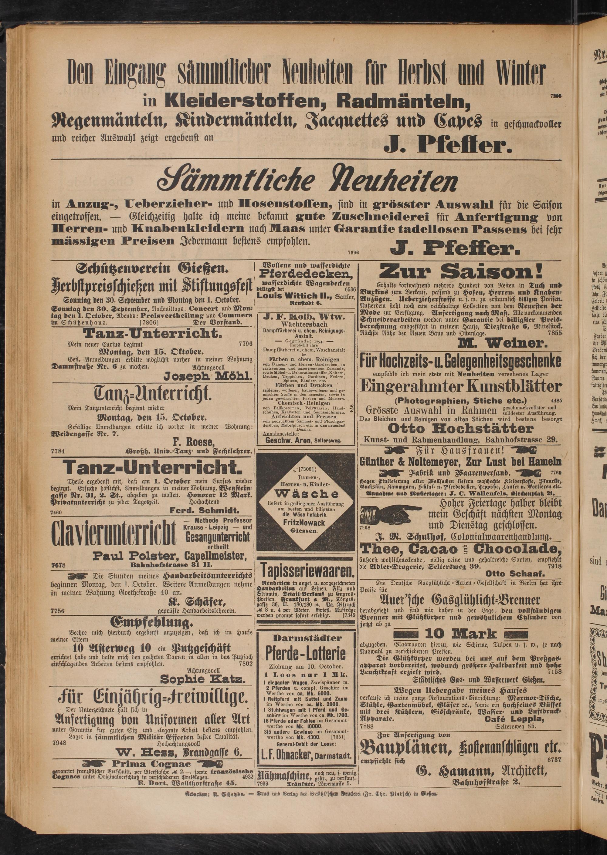 Sonntag den 30. September und Montag den 1. October. >. Sonntag den 30. September, Nachmittags: Concert und Montag den 1. October, Abends: Preisvertheilung und Commers im Schützenhaus. [7806] Der Vorstand.