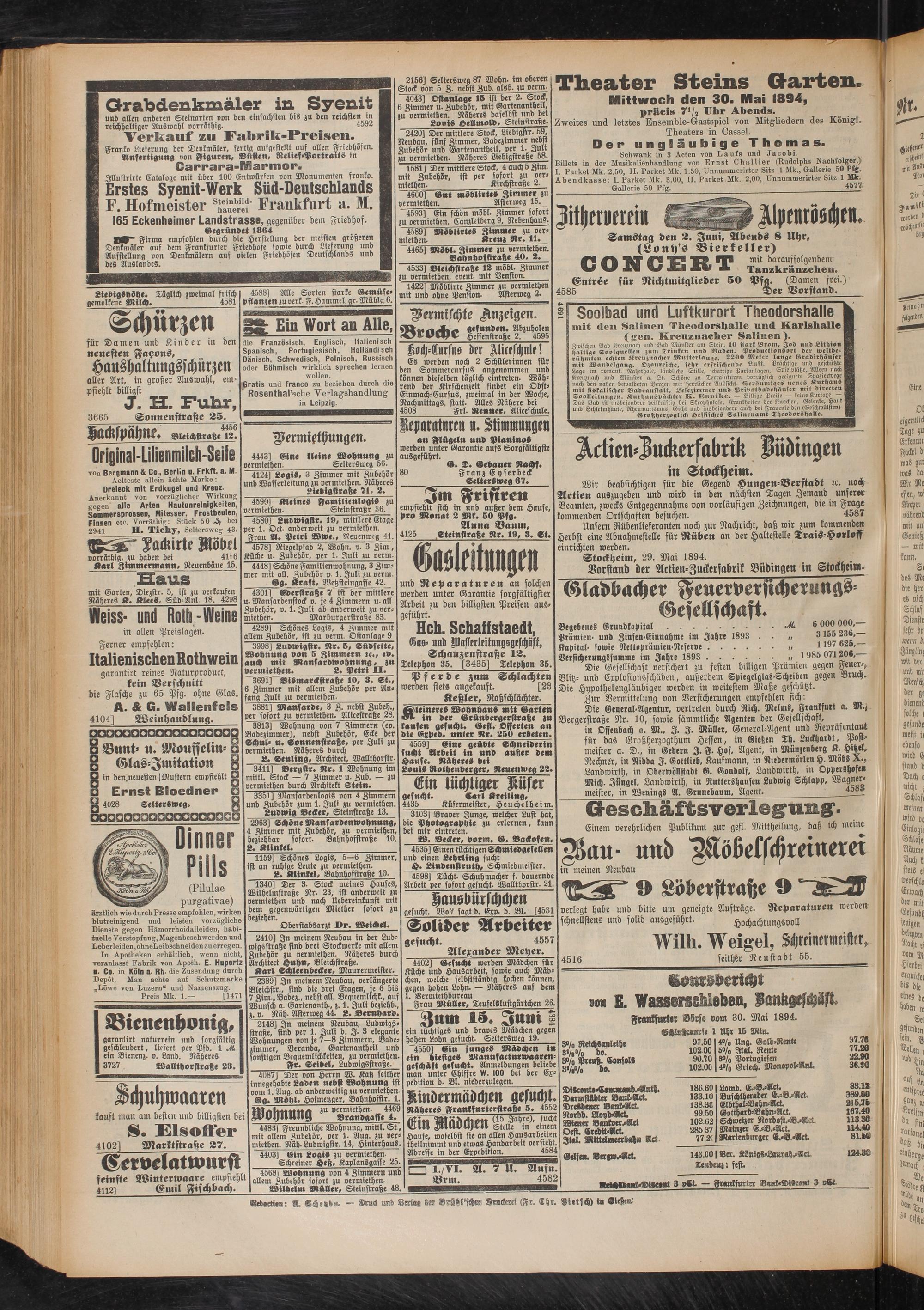 Theater Steins Garten. Mittwoch den 30. Mai 1894, präcis 71/2 Uhr Abends.