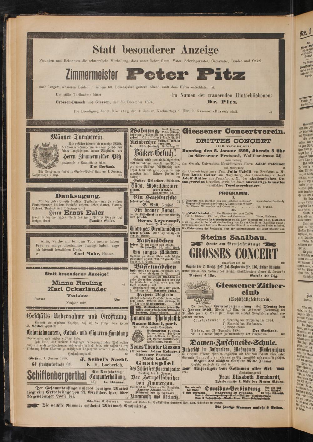 Sonntag den 6- Januar 1895, Abends 5 Uhr iin Giessener Festsaal, Wallthorstrasse 34]