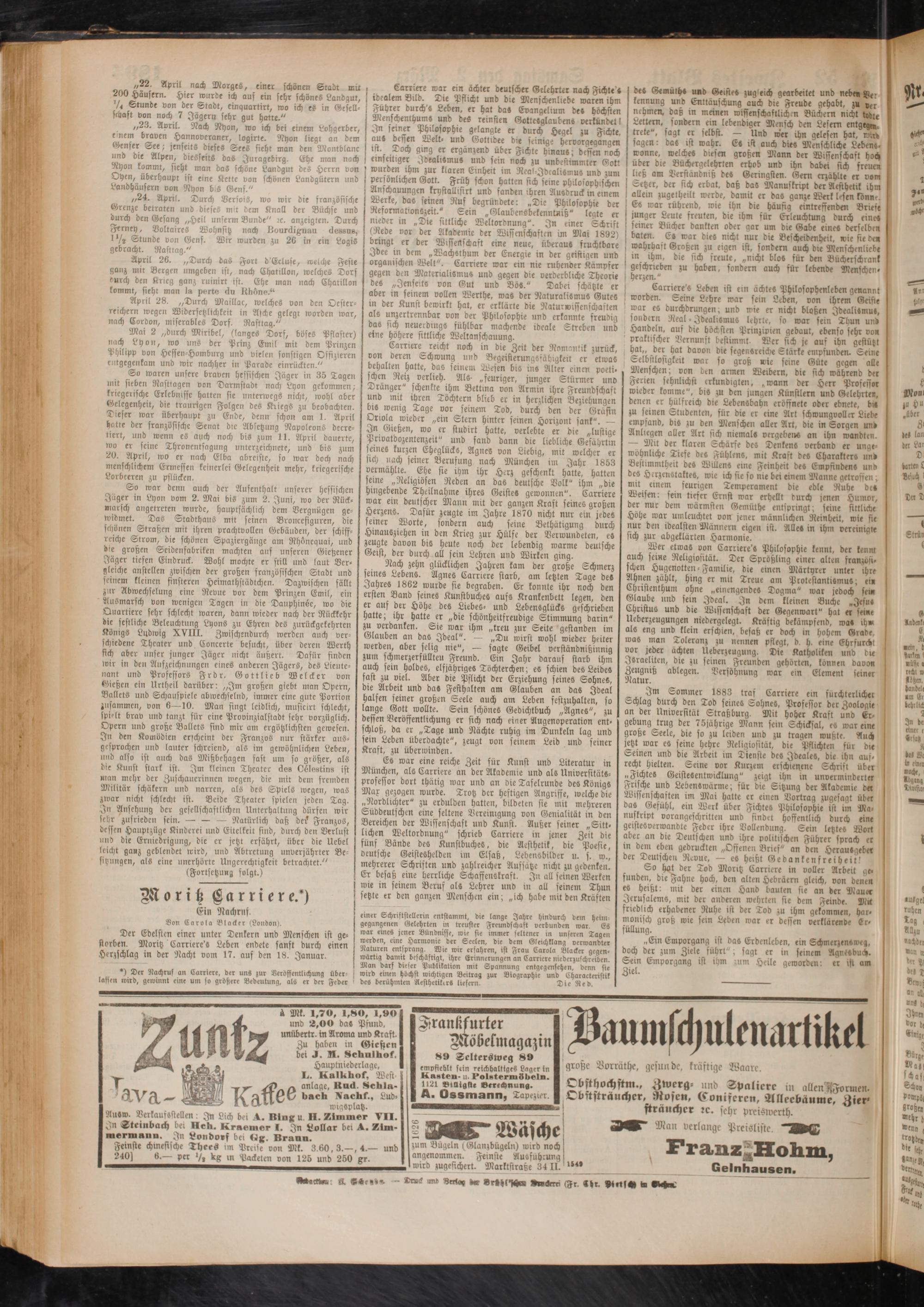 (Saniere reicht noch in die Zeit der Romantik zurück, von deren Schwung und Begeisterungssäbigkeit er etwas bemalten hatte, das feinem Wesen bis ins Alter einen poeti- fcjjen Reiz verlieh. Als- „feuriger, junger Stürmer und -Lränger" schenkte ihm Bettina von Armin ihre Freundschaft und mit ihren Töchtern blieb er in herzlichen Beziehungen bi« wenig Tage vor seinem Tod, durch den der Gräfin Otiola wieder „ein Stern hinter seinen Horizont sank". — In Gießen, wo er studirt hatte, verlebte er die „lustige Privatdozentenzeit" und sand dann die liebliche Gefährtin seines kurzen Eheglücks, Agnes von Liebig, mit welcher er Hd) nach feiner Berufung nach München im Jahr 1853 vermählte. Ehe sie ihm ihr Herz geschenkt hatte, hatten ferne „Religiösen Reden an das deutsche Volk" ihm „die hingebende Theilnahme ihres Geistes gewonnen". Carriere war ein deutscher Mann mit der ganzen Kraft seines großen Herzens. Dafür zeugte im Jahre 1870 nicht nur ein jedes feiner Worte, sondern auch feine Bethätigung durch Hinausziehen in den Krieg zur Hülfe der Verwundeten, es zeugte davon bis heute noch der lebendig warme deutsche Geist, der durch all fein Lehren und Wirken ging.