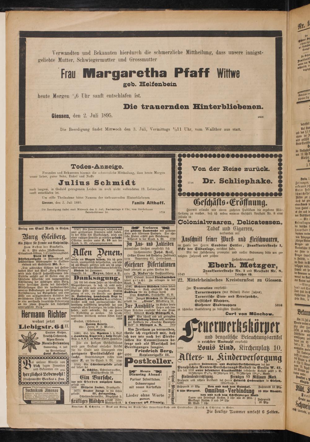 Die Beerdigung findet statt Mittwoch den 3 Juli, Nachmittage 6 Uhr, vom Sterbehause Bahnhofstrasse 20. * 5759