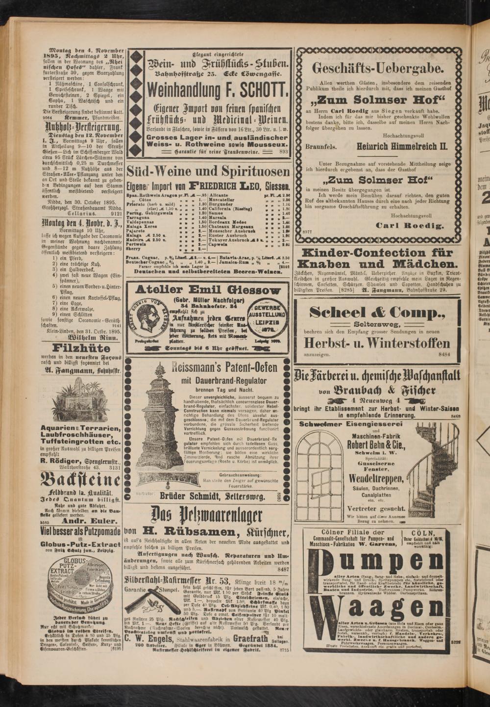 Montag den 4. November 1S95, Nachmittags 2 Uhr, sollen in der Wobnung defl „Rhei nischen HofeS" dahier, Frank furterstraße 30, gegen Laarzahlung versteigert werden: