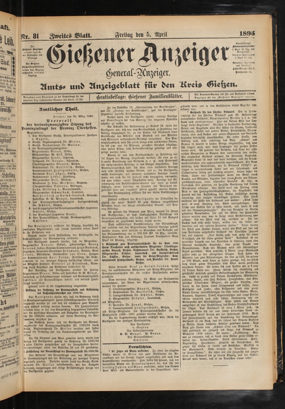 3. Ersatzwahl zum Provinzialausschuffe für die Ende 1895 ihrem Dieustalter »ach ausscheideudeu Mitglieder: Oberbürgermeister Gnauth, Gieße», Rechtsanwalt Dr. Entfleisch, Gießen, Bürgermeister Stapler, Lauterbach, und Laudgerichtsrath Dr. Schäfer, Gießen, fowie die Erfah-Mitglieder: Som- merzieurath Heyltgenstaedt, Gießen, und Profeffor Dr. Frank, Gießen.